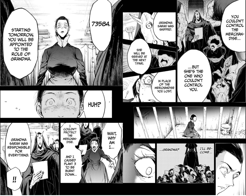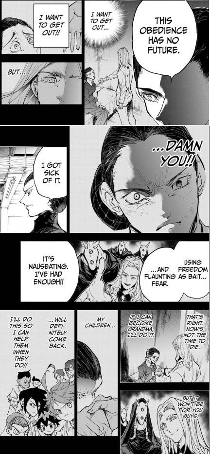 Meanwhile, inside a prison cell back in Grace Field, Isabella is paid a visit by Grandma and some of the head demons. Grandma brings up Isabella’s “error,” mentioning what a shame it had been since she was a very valuable to their system. She also tells her that she would return all the children back to the house and return back to their shipment schedule, and that Isabella would “be able to see them soon.”