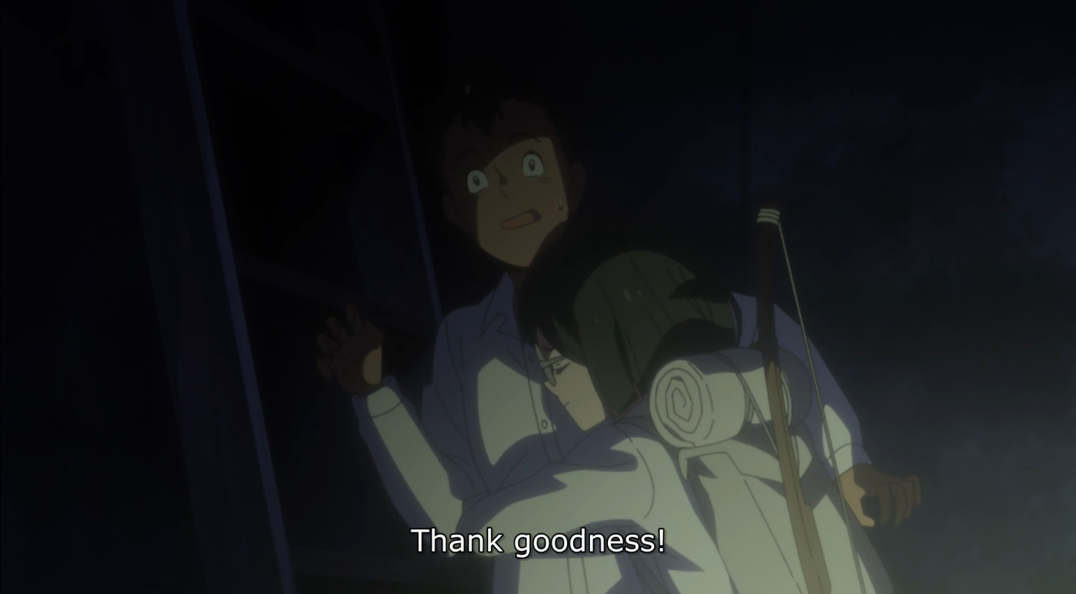After a month passes by with no other incident at both there and in Grace Field, the shelter’s entrance gets bombed and raided by armed guards looking for the children, most likely from Grandma’s plan. Thanks to quick judgement and Christie guiding the way, they managed to push through some of those guards and escape before getting caught again near the forest. However, the sound of the bullets being fired upwards by one guard attracts a wild demon, and gets all the adults there eaten before Ray kills it himself with an arrow to its eye.