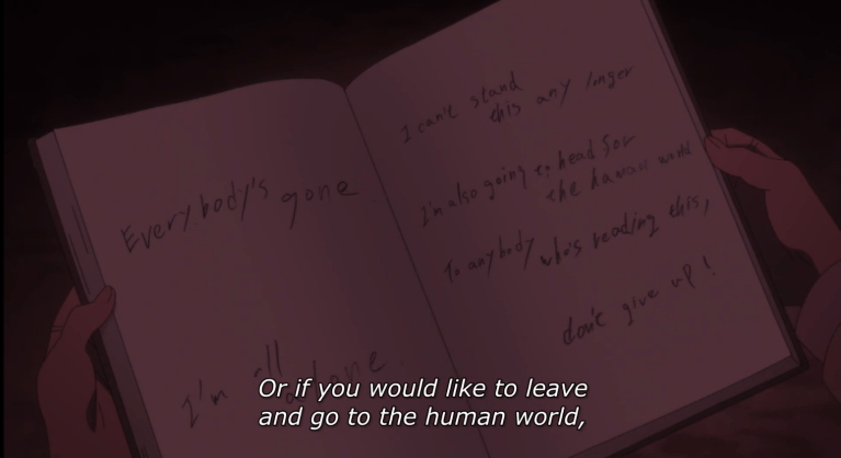 We picked up where we left off last episode, with William Minerva introducing himself via a call recording on the payphone to Emma. “Minerva” is actually James Ratri, someone who used to take part in running the farm system, but has now turned aside from that to help them towards freedom instead. As he mentions being betrayed by the people around him in his attempts to leave clues for the children, Anna spots a notebook with an interesting message as another part of the room reveals an unsettling list of names on it. At the end of his recording, James reveals the code word that lets the pen point the kids towards a new location if they want to leave for the human world. Only two things in these scenes are anime-original, the new “FUTURE” code word and the subsequent location mentioned later below, and the presence of the notebook itself.