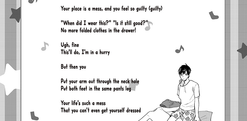 Truth be told, it could be successful either way—that which it’s trending, toward the usual (and with hints that there’s some heart to it), or back toward the darker humor of the first half. The mangaka’s writing is sharp and can support the madness of the setup, so my hope is that even if Life Lessons becomes more basic, that it won’t lose that sense of depravity, reflected not just in the sneaky punchlines, but in longer jokes like the childrens song, several of which are written in full in these chapters. My favorite of these is “Arm Through the Neck Hole,” which begins, “Finally home at 2 a.m. / Time to put your chores off again.”