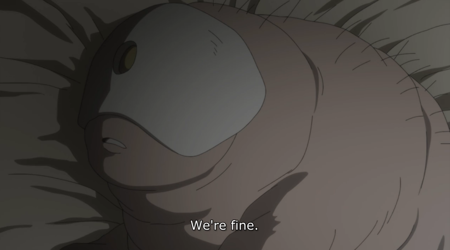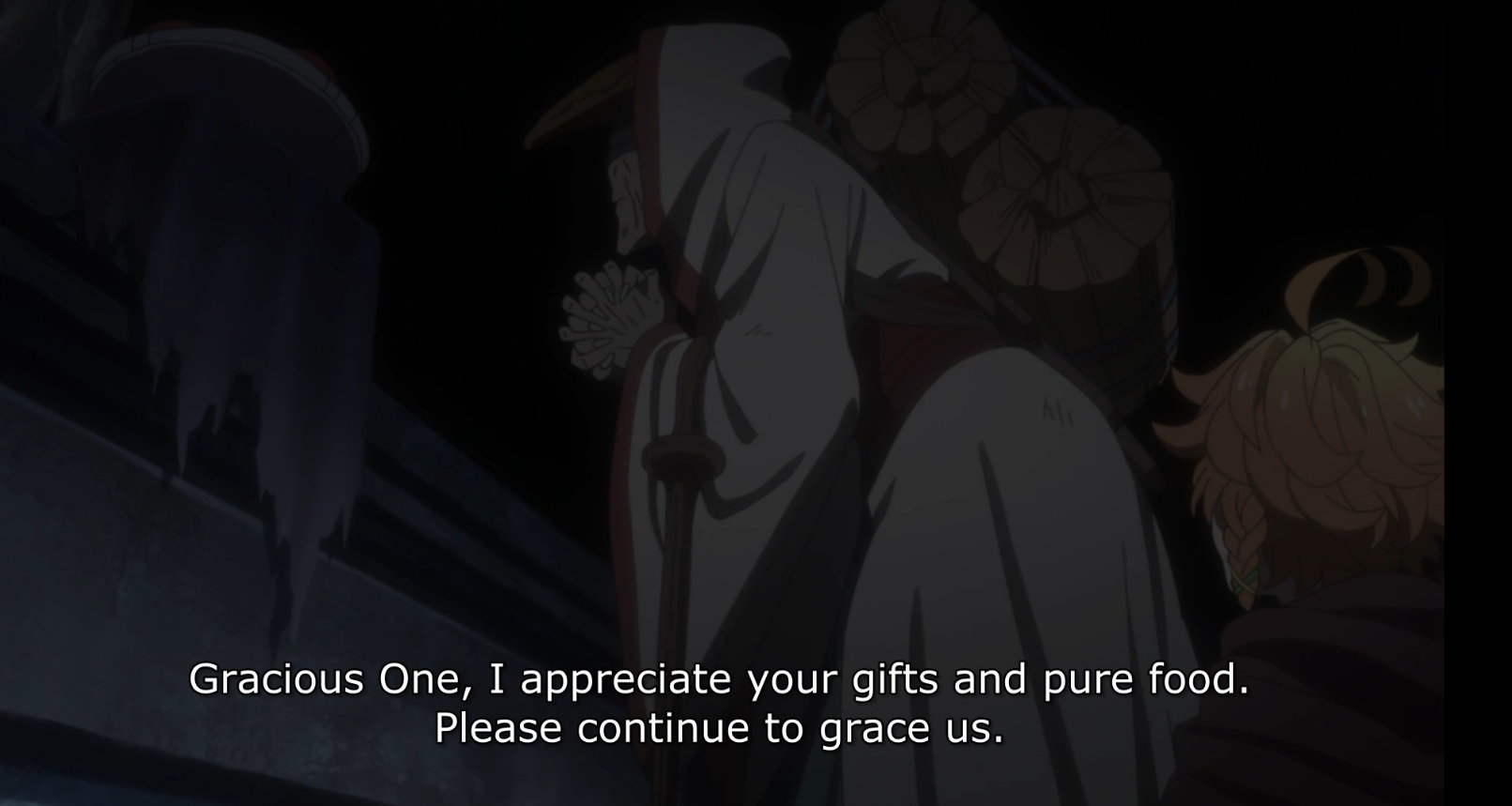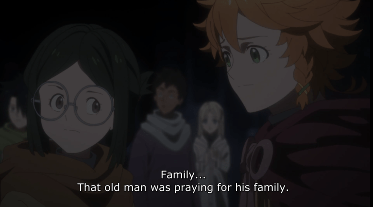 The day after, as Emma’s group allows Thoma and Lannion to come gather food with them, the wind chime the kids used as an alarm sets off. They hide further towards the side of the temple from what’s revealed to be an blind, elderly demon who’s apparently encountered them enough times to the point of familiarity.