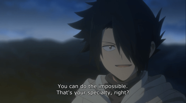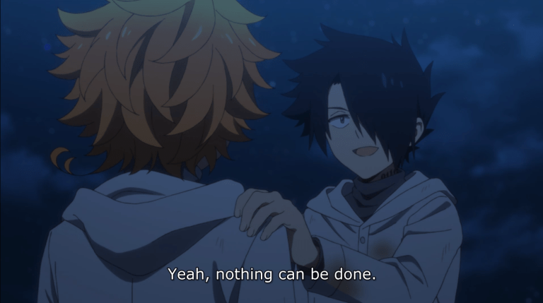 Later that night, while on watch duty in the tower area, Ray questions Emma’s true feelings about Norman’s plan. With some prodding from him, Emma finally admits that even if the plan would keep the kids safe from danger of being shipped out or hunt, she doesn’t want the demons to be killed either. Even so, without any knowledge of any other option available, she doesn’t know what action to take to avoid that path. With no one else to really turn to, she asks Ray if he can think of a solution to this conundrum. His answer? He doesn’t know either.