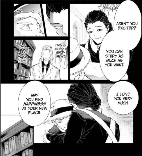 - It’s interesting to see how a scene’s adaptation can change with interpretation if a certain action is done before another. For instance, Isabella gave this look to Norman before hugging him in the manga, which makes it look like a power move on her part. What I got from the anime version, since we see her make this face after she hugs him, is that this is Isabella trying to bury down whatever sadness/guilt she’s feeling about this situation, especially since Norman asked her short before that if she was happy with her situation in Grace Field.