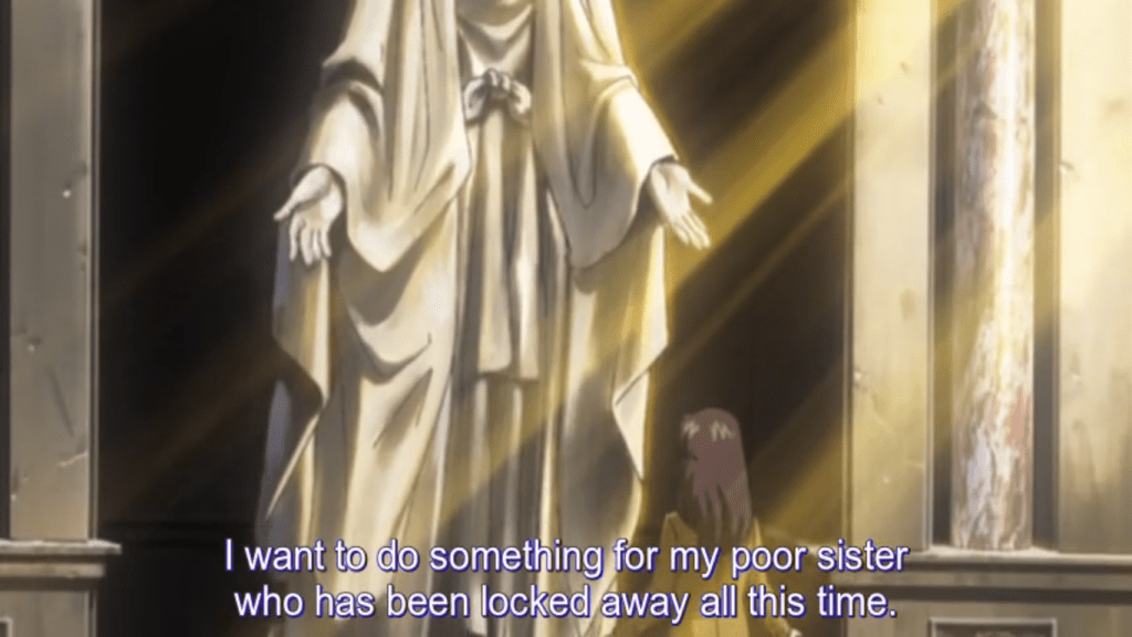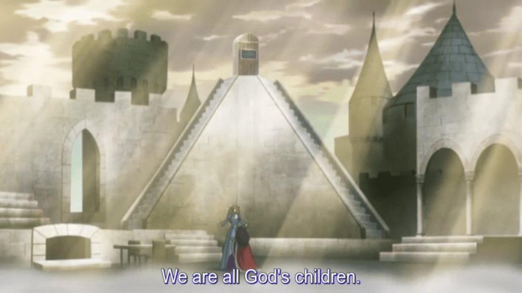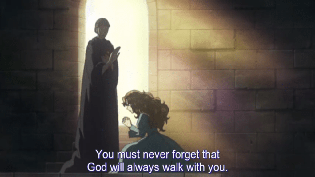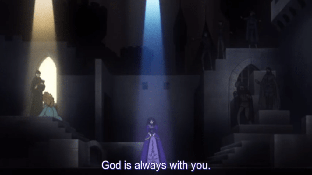 And so, aided by the church, the joy of Princess Aldis transcends what her father, her mother, and her people have given her, and goes from there to a higher place. “I´m with God,” she says, determined, when she serves the needy, when she works for peace, and even when she loses everything else. Seeing her beauty and goodness, her people acknowledge: “The glory of God is with our Princess.” Meanwhile Princess Orgeld explicitly equates her experience with that of Hell, a Hell into which she is consciously sinking by gaining power at the price of doing what was done to her, and worse. “Just as you have violently taken the throne,” as Miss Tsukigage’s character reminds her, “it may be taken violently from you.” When Cain kills Abel, the world suddenly becomes murderous in his eyes. Sin is the seed of what culminates in Hell.