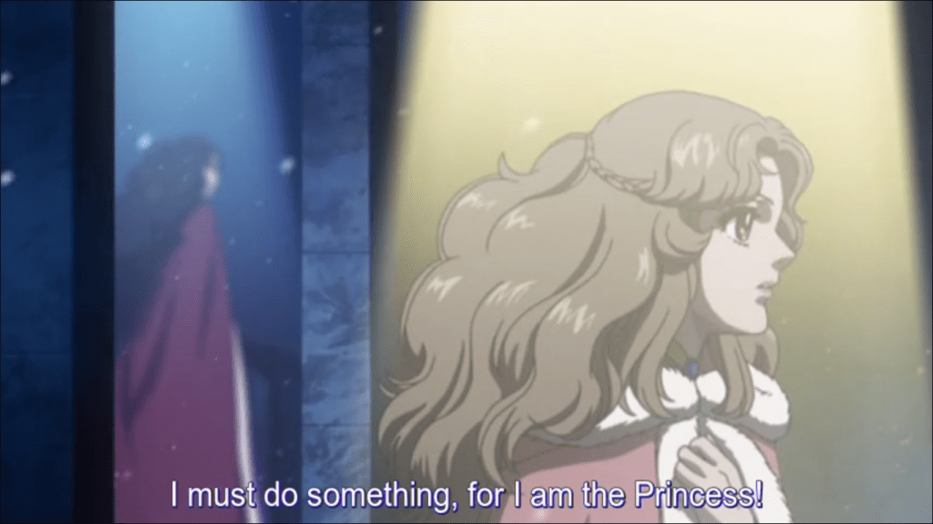 We have seen isolated scenes of more known pieces, but in the episodes that follow we are given The Two Princesses in full. Orgeld’s mother was cruelly executed for a crime of which she was innocent. Her young daughter was raised in a cold, remote prison, while the conspirators, the new queen and her father, enjoyed their triumph in the palace. There, Aldis was born and raised, surrounded by love and admiration. So Orgeld escapes, betrays her allies, conspires, infiltrates the court, gets recognition, instigates a war, and then poisons the king and is crowned. She will execute the killers of her mother, the mother and the grandfather of the Spring Princess, putting Aldis in the very prison that hold her. She hopes to break her spirit, to prove a point.