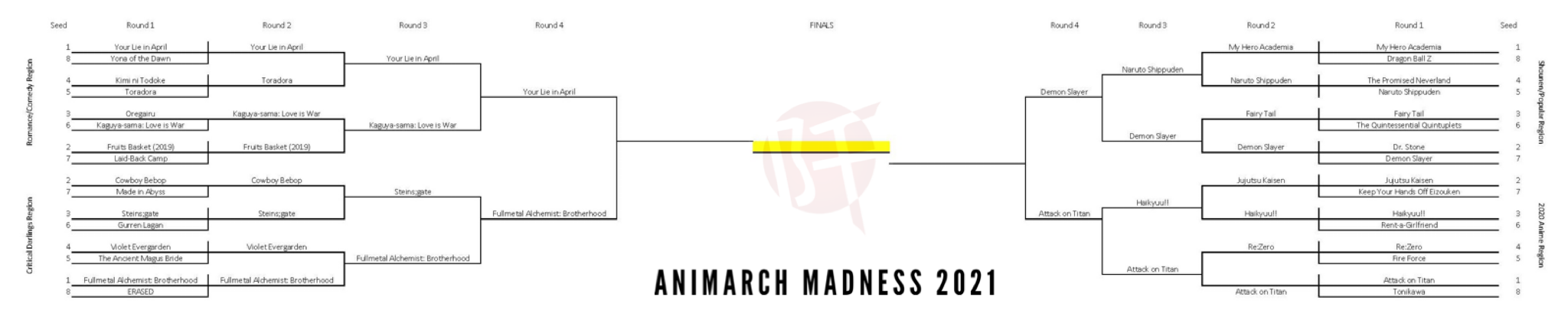 Welcome to week four of AniMarch Madness! The quarterfinals held few surprises, with all three number one seeds that made it in coming out as well. The closest match featured last year’s runner-up and seven-seeded Demon Slayer (seeded so low because of it’s difficulties in the play-in round) defeating fifth seed Naruto Shippuden, which had its strongest showing in this tournament ever.