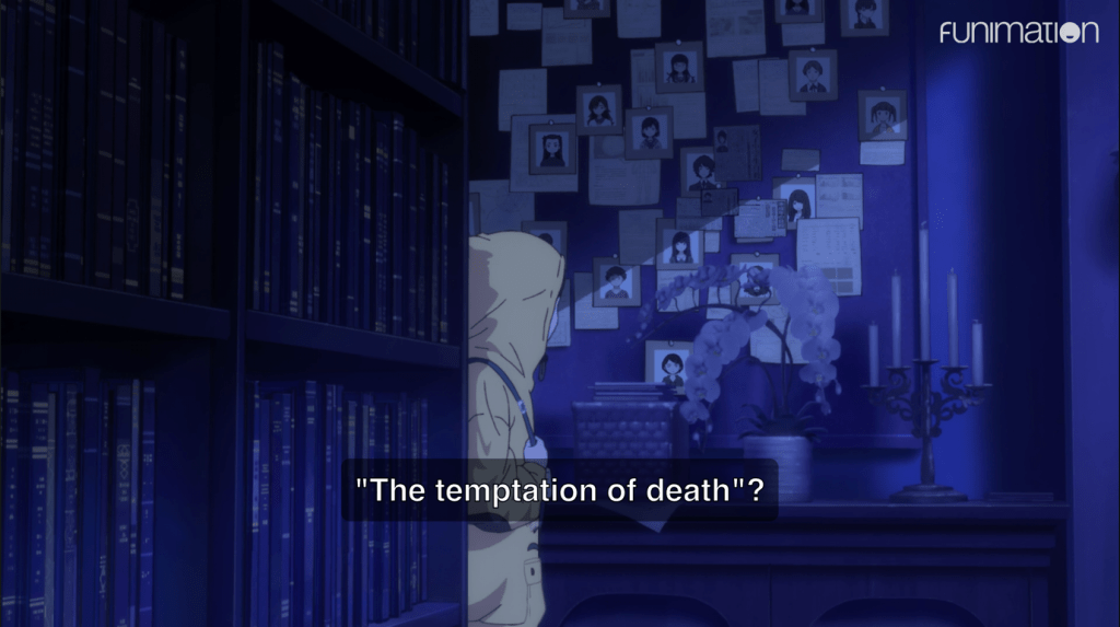 The notion of death as somehow attractive or even beautiful is rather alien to Western culture. Certainly, there will always be some who romanticize death, à la star-crossed lovers (Shakespeare, I’m looking at you). But in general, Western culture views death as something ugly and frightening, something to avoid until it is staring you directly in the face, and even then, closing your eyes in denial is a perfectly reasonable response. Death is one of those things we don’t talk about. In my experience, Anglo-American culture is not very good at even mourning death. We lack the grieving rituals and observances of other cultures, and instead seek to confine death to the sealed, sanitized spaces of hospitals, care homes, and funeral parlors. We keep it shrouded tightly in silence. How could there ever be anything like the “temptation of death”? How could we ever consider death to be something desirable? Are the eggheads or CloverWorks simply aestheticising suicide and death here to make it sound deep and philosophical?