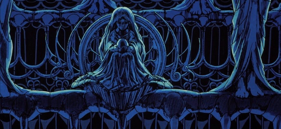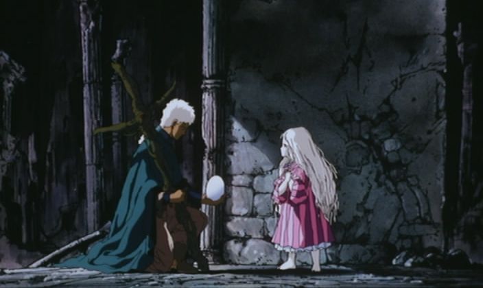 So what? Do the Christian notions just not fit in this complex, deconstructed reality? Or… do they, after all? Because there is something powerful, even haunting about them. They remain there over time, however one may escape them. It is so in Angel’s Egg, too. According to this, somewhere in the forgotten corners of the Internet, there must be an article called Dead Souls: The Abandoned City of God in Mamoru Oshii’s The Angel’s Egg, by that 1996 interviewer, Carl Gustav Horn. I haven’t found it as for now [update: Twwk found it for me!], but that title makes sense to me. When a tree is very old, and yet still lives, sometimes the limbs are strangely twisted. This is a story about a threatening, tomb-like world in which enigmatic Christian elements, sin, damnation, redemption, angels, crosses, deluges, praying statues, even the egg of Easter, still wander, half-forgotten but active. The prodigal son went to a faraway country. Israel, scattered, was exiled in Babylon. We are the abandoned city of God, darkened, confused souls in which veiled signs of hope and meaning are still present.