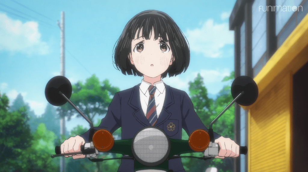 A train pulls into the station. It is nighttime in a small town, and everyone is asleep as Debussy’s Arabesque No. 1 floats gently through the air. The alarm sounds, and the music stops. Another day begins for lonesome high schooler Koguma, who struggles out of breath to cycle the hill to class. She is the girl with nothing: no parents or friends to love, no dreams or ambitions. Her world is washed out and grey, despite her youthfully rosy cheeks. On her way home later, a boy on a scooter passes her pertly for the second time that day and something in our heroine snaps. She turns around and heads toward…a motorcycle shop. She has had enough of life passing her by. And so begins this delicate love story of a girl and her Super Cub 50cc Honda motorbike. The bike has a morbid past, having been involved in the deaths of three people, but this means it is affordable for our impoverished protagonist. She is unfazed and only asks, when given a free helmet and gloves as part of the sales promotion, how many deaths they caused. The rest of the episode is devoted to her growing affection for the bike and determination to learn how to drive and maintain it properly—which ironically leads to her being stranded without gas at the conbini in the midnight hour! But the trusty owners’ manual saves the day by revealing to our plucky mc how to activate the reserve fuel line. On her way to school the next day, she reflects on how her much her life has changed—now she has her Cub.