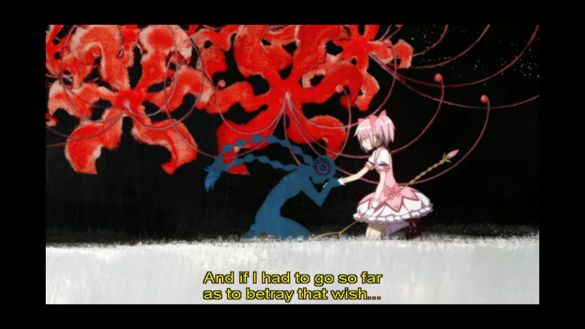 In the world of Puella Magi Madoka Magica, there is no possibility of a personal savior. It is a world shaped by the Buddhist principles of reincarnation, karma and the path to transcendence. As such, to fulfill her wish to become a savior, Madoka must leave her human form— she must transcend her human existence and become something else. And it’s the fact that she steps into abstract “thing”-ness that breaks Homura.