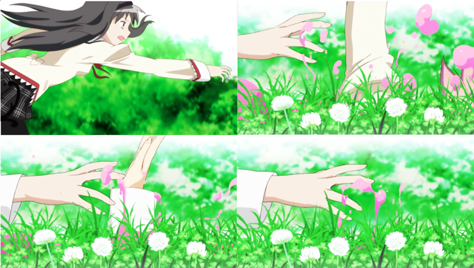 The lycoris or spider lily seen here (and in place of Homura’s head in her witch form, Homulily) symbolizes death and reincarnation, and is thought to lead souls in the afterlife. Check this out for more details.