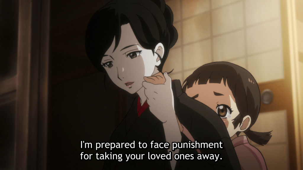 Sawa’s obsession has narrowed and restricted her view of reality to such an extent that she can only understand it through the paradigm of vengeance, an eye for an eye. She’s been beholding a destructive force, and it has rewritten her sense of self. Its corruptive influence even contorts how she is able to show affection. When Asahi clings to her, sobbing, Sawa’s expression softens momentarily before hardening again as she takes Asahi’s tiny hand, lifts it up to her (Sawa’s) carotid artery, and tells the girl to “aim for here”. The only way Sawa knows to comfort a crying child is to tell her precisely how to exact revenge. (And no wonder, since she herself was adopted and trained in this way by Yoshinobu, the head of Nue, who is exploiting her powers for his own ends.)