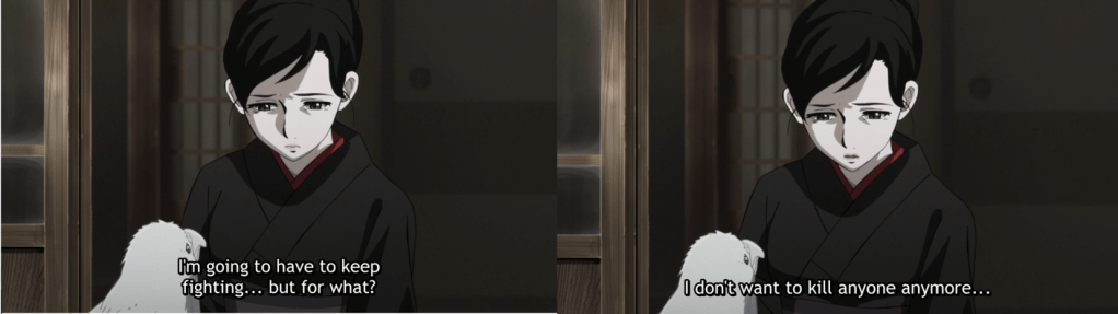 Her plan is actually to die, in a sense by her own hand. Or more specifically, by the hand of the little girl she has taken in and instructed in the ways of assassination—or at least tried to. Sawa killed Asahi’s parents while tracking down Janome, and subsequently adopted the girl, who is about the same age as Sawa herself was when Janome slaughtered her village. She did it not out of penance, but out of unflinching self-awareness: rather than justify herself with the excuse of self-defense (which it technically was, except for the vast difference in skill level…), Sawa confronts her culpability and extends to Asahi the right to vengeance that she herself has been living by all these years. Sawa is no hypocrite.