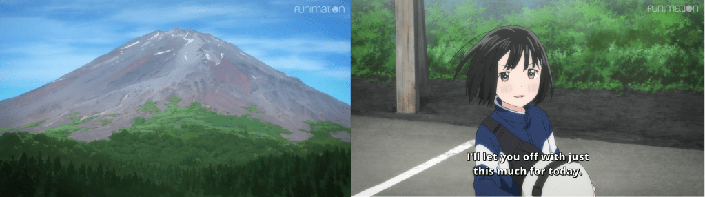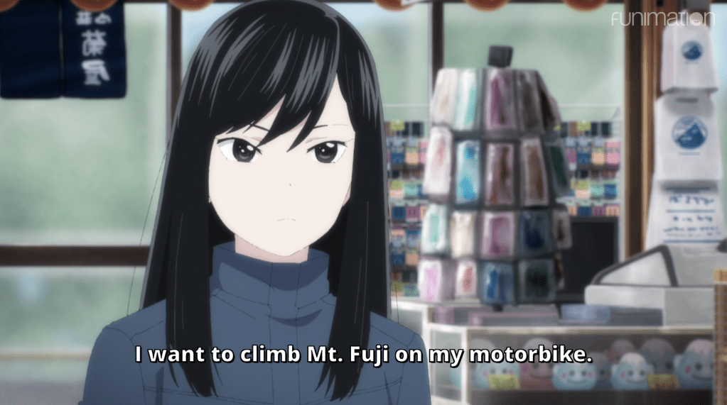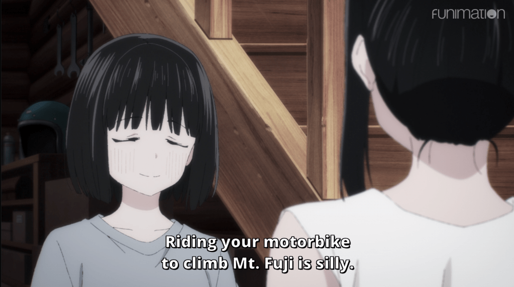 Later, when Reiko shares with Koguma how she spent her holiday, her meek friend declares the whole undertaking to have been “silly.” Reiko just laughs in self-effacement (she really is best girl!). But clearly the story stays with Koguma, and that night she begins to wonder whether it might not in fact be possible. In episode six, Koguma finds herself having to plot a journey that could take her through Mt. Fuji territory, but she cautiously decides to take a longer route to avoid the difficult terrain. Yet, as she covers more and more ground on her journey, growing in confidence and making better progress than expected, Koguma decides to take what is now a detour up to Station 6 of the mountain. It’s a tough go, and she spends a lot of it in first gear, but she makes it. And while gazing out at the view, she understands what Reiko was up to. A transformation begins to take place in Koguma; she smiles more and even laughs (a first)—several times!—later in the episode. This “shared” mountain struggle brings the two girls closer together. In episode seven, Koguma even takes the lead in volunteering herself, Reiko, and their Cubs to solve a logistical problem for the class’s cultural festival committee—surprising even herself. She is becoming more confident, more connected, and more engaged with the world around her. Slowly, the Super Cub and Reiko are changing Koguma’s reality. And the mountain has a lot to do with it.