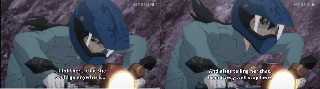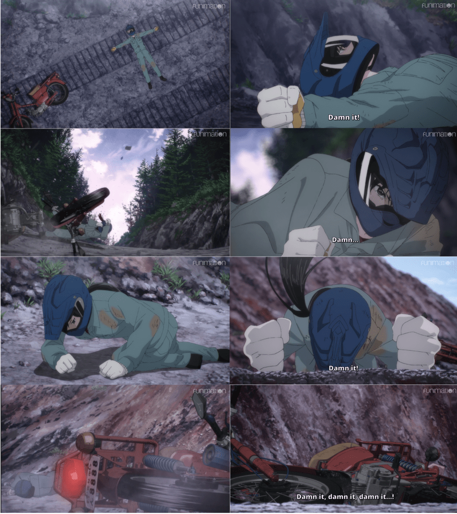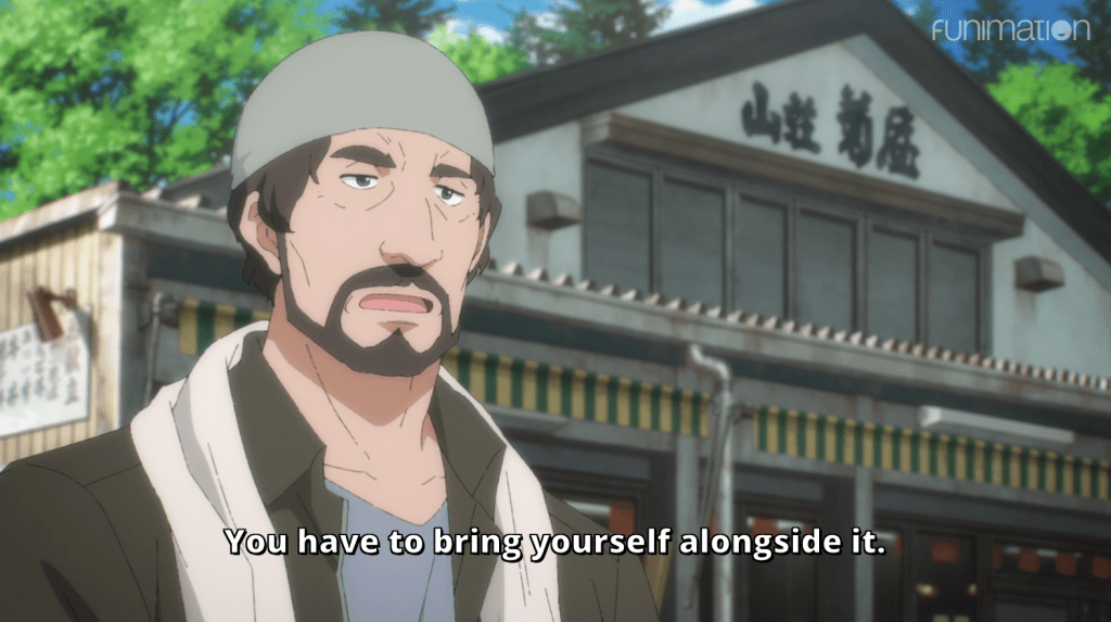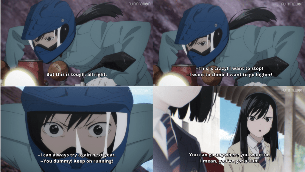 For Reiko, her boss’s advice to come alongside the mountain rather than standing against it makes her realize she was fighting the wrong battle, or at least fighting it the wrong way. Instead of setting herself against the trail and then “going limp” when it bested her, Reiko understands that she needs to “hold herself down” and fight as hard as she can, in a kind of partnership with it. This reminds me of the Hebrew definition of the verb “to wait”, as in, to wait on the Lord: It isn’t a limp, listless waiting, just passing the time, but rather a state of battle-readiness and determination, like a woman in labor who “waits” for her child to be born. She’s not just lying there twiddling her thumbs. When Reiko puts this kind of focused, active “going alongside” into practice instead of just flinging herself up the incline recklessly and trying to ride it out, she is able to delight again in the challenge, and do things she had not managed before, like pushing her Cub back down when it pops a wheelie rather than letting it lose control and toss her. She discovers new depths of resolve and ability in herself.