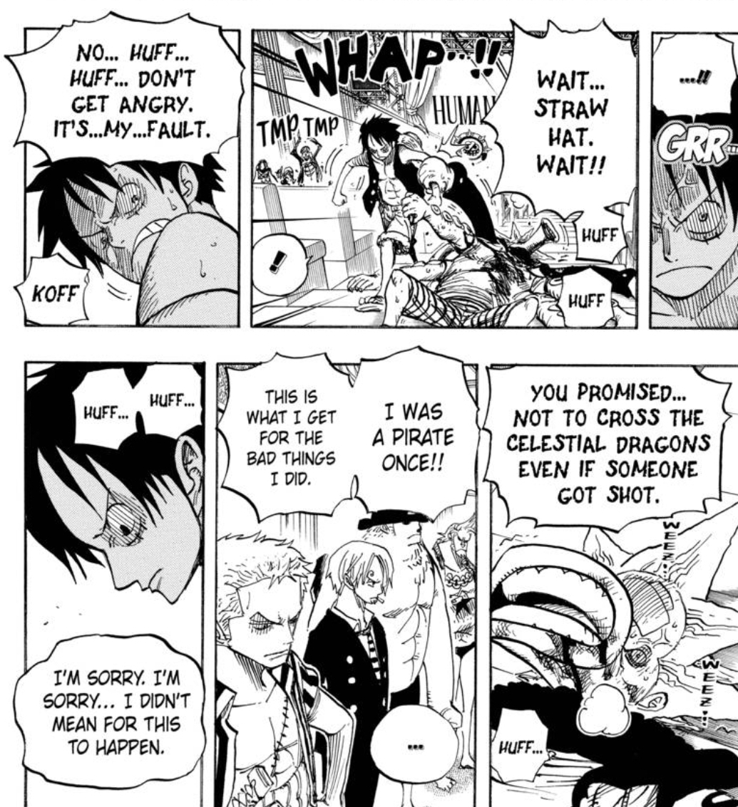 As Luffy tries to march up to the Celestial Dragon who shot down his friend, Hatchan calls to him from the ground and takes the blame for every issue they have had.