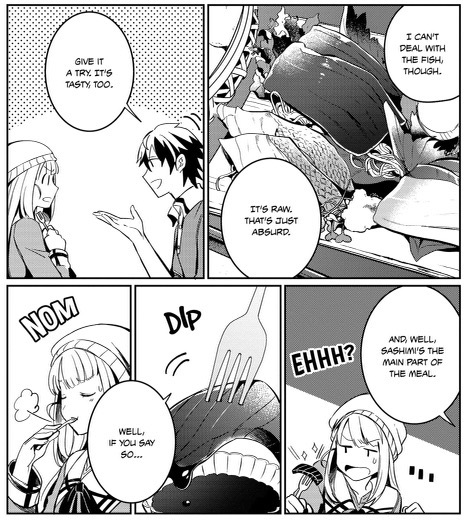 I really enjoyed how the manga expresses that time passes differently, in addition to a few aspects that give a clear distinction that this is another world (like the food being bland and Kazuhiro appearing younger). These aspects seem so subtle and natural in the story that I’m very much impressed with how the world is presented to the reader! This is probably my first foray into a fantasy manga that has dragons, and I loved the lore surrounding them (The elves too!). The Arkdragon (a dragon we meet later on) was nothing like I expected and definitely made me laugh!