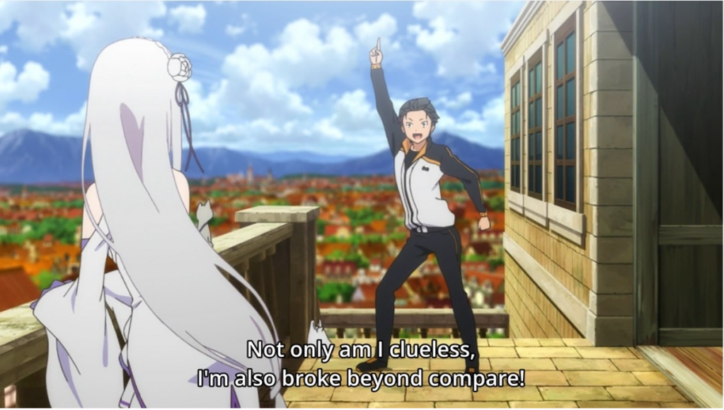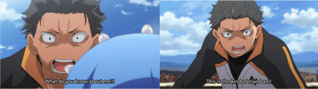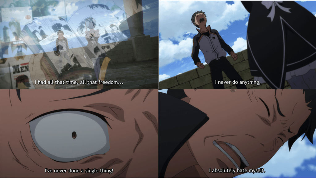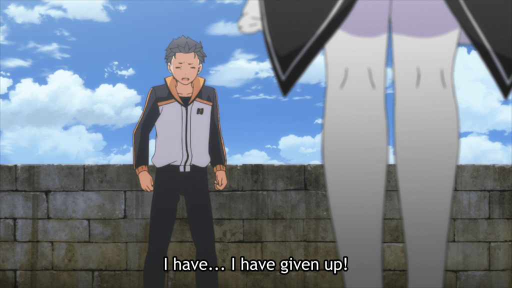 It’s a truth that he claims everyone has been telling him, and that his circumstances have been confirming: the truth that he is a failure, he is weak, selfish, incapable, useless… the list goes on and on—and so does Subaru—for several uncomfortable minutes. Because it is uncomfortable, listening to Subaru’s “truth” as he explains to Rem why he has given up on everything and everyone. In the face of this “truth”, he has given up on himself.