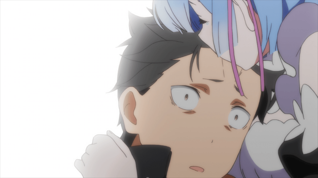 Three times, he asks Rem why she loves him. Each time, she answers, the third time even with dramatic lighting and a flock of white doves for emphasis. But it’s not enough. He is not convinced. Again three more times, Subaru reiterates his unworthiness, his isolation.