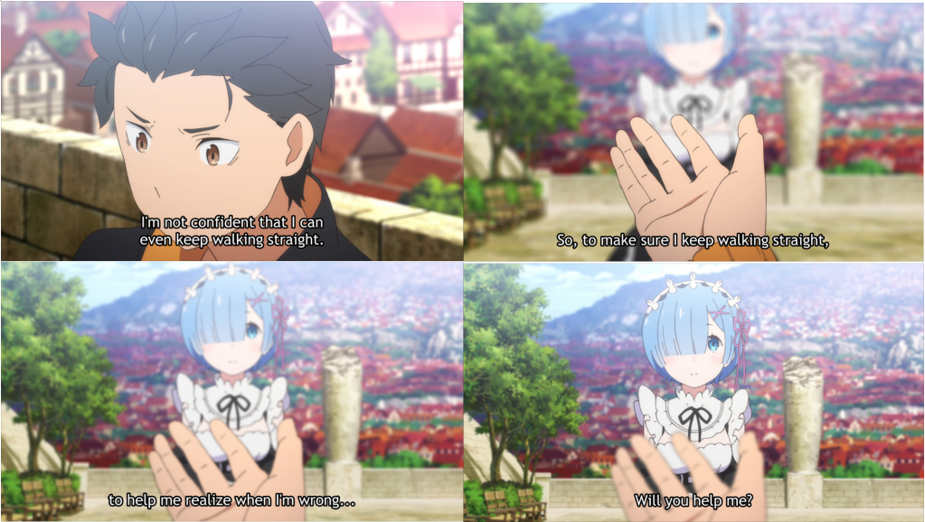 In the face of this love that is more than romance, Subaru returns to himself. Maybe for the first time. He stands up straight and lifts his head, his tone calm as he admits, “I can’t do anything alone. I lack in everything. I’m not confident that I can even keep walking straight. I’m weak, fragile and small.” The words are still centered on his shortcomings, but the edge of accusation is gone. Crucially, he doesn’t stop there, but keeps going: “So, to make sure I keep walking straight”—he reaches out his hand a second time to Rem—“to help me realize when I’m wrong,”—the focus of the shot shifts from Subaru’s hand to Rem—“Will you help me?” With this question, Subaru finally sees beyond himself, beyond his own limitations. His focus shifts beyond his own empty hand and he sees Rem, and not just as a way out. As he does, Subaru begins to grasp the rest of the story, which does not end with his limitations. Shame will always tell us that we’ve reached the end of our story when we fail, but love knows differently. Subaru begins to listen to what love has to say.