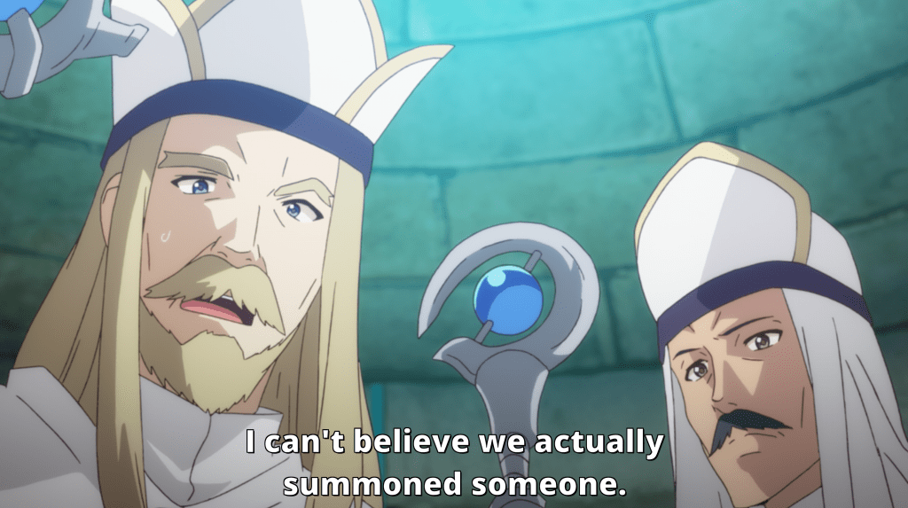 That bit where he flipped up his collar I imagine was a throw back to Yu-Gi-Oh, and I burst out laughing when it happened. I really enjoyed the episode too, even though the king got on my nerves with how cowardly and wishy-washy he seemed, although he did redeem himself some later in the episode. Plus the concept is refreshing for an isekai where the protagonist isn’t just immediately going in sword swinging.