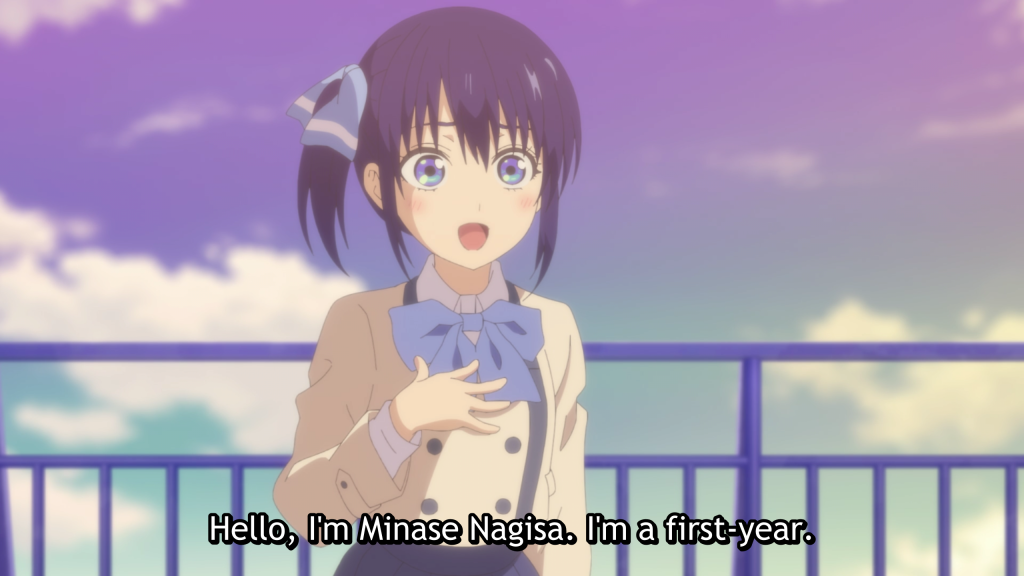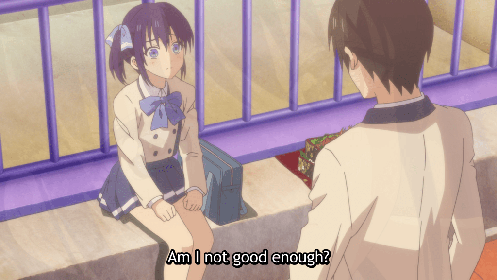 While waiting on Saki to finish up with basketball practice on the school roof, a mysterious purple-haired girl comes up and rather abruptly confesses her feelings to Naoya. Because that’s where all the best confessions take place, of course. That or underneath a blooming sakura blossom tree. Anyway, our new girl’s name is Kotonoha Katsura—oops, sorry again…Nagisa Minase, and it seems as though she has feelings for Naoya herself, putting in hours everyday to make herself look as attractive as possible, and spending 8 hours and tens of thousands of yen to make a perfect lunchbox for him. Because that’s what all girls do whenever they want to confess to a guy they only just got the courage to speak to! Naoya is taken aback by this showing of love, and initially does the right thing by saying that he can’t return her feelings because he already has a girlfriend (what any NORMAL guy would do). However, Nagisa is not dissuaded by this news, and says that she’ll never give up on him and will confess her feelings again one day. This seems to strike a nerve with Naoya; he doesn’t want to turn down Nagisa, nor does he want to betray Saki. So what does he decide to do?