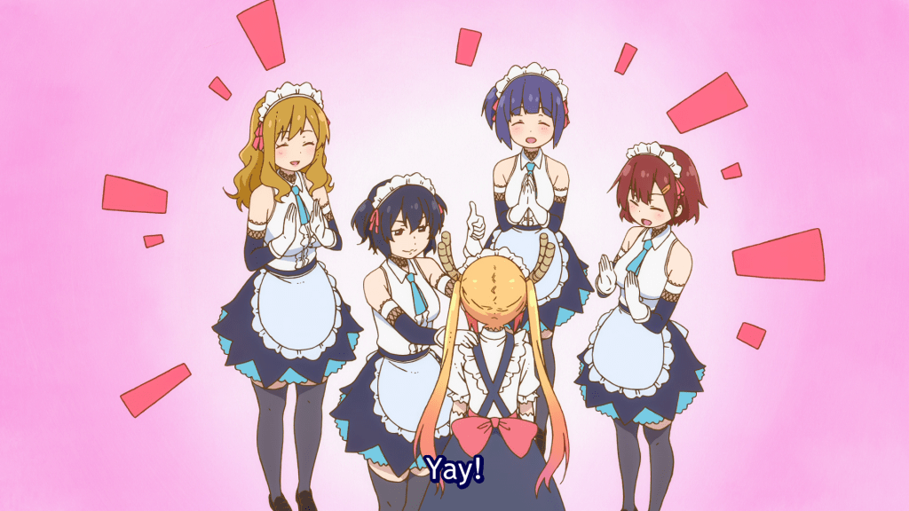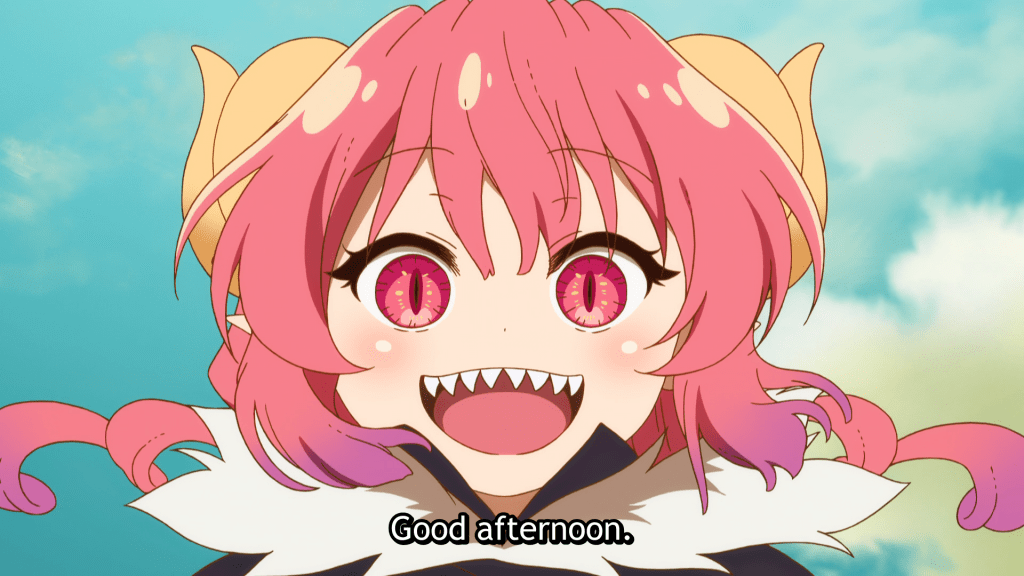 Well, now that I’m done gushing about Kyoto Animation, let’s talk about the actual episode. All our favorite characters are back in this episode, and they’re as adorable and wacky as ever. In fact, it almost seems like they’re more like themselves than usual this season. The maid café storyline highlighted Kobayashi’s chuunibyou-esque antics in bright tones, which was fun to see, while the introduction of Ilulu brought things back to the thematic tensions from the previous season. Tohru and Kobayashi are still struggling to understand what it means to live alongside those with sharply differing values, and that struggle will likely take center stage in Kobayashi S. I’m looking forward to seeing what this season holds in store for these two—and for all the other isekai dragons that we’ve come to know and love.