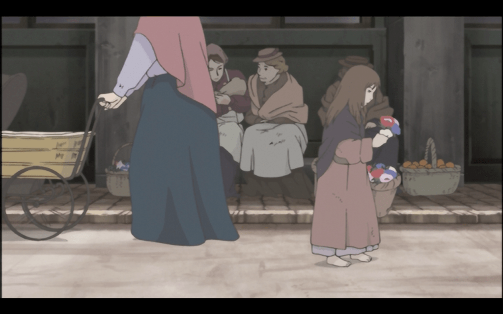 The English dub does a much better job of hinting at the social divisions between various characters. There’s a good range of accents, including some Irish thrown in the mix among the working class, which is appropriate for the time. The accents can be a little rocky in places, but overall the dub settles into a good groove by the midway point and really is worth listening to, even for a diehard subber like me. (The dub was also a passion project of sorts, financed by a Kickstarter campaign back in 2018—great job everyone!)