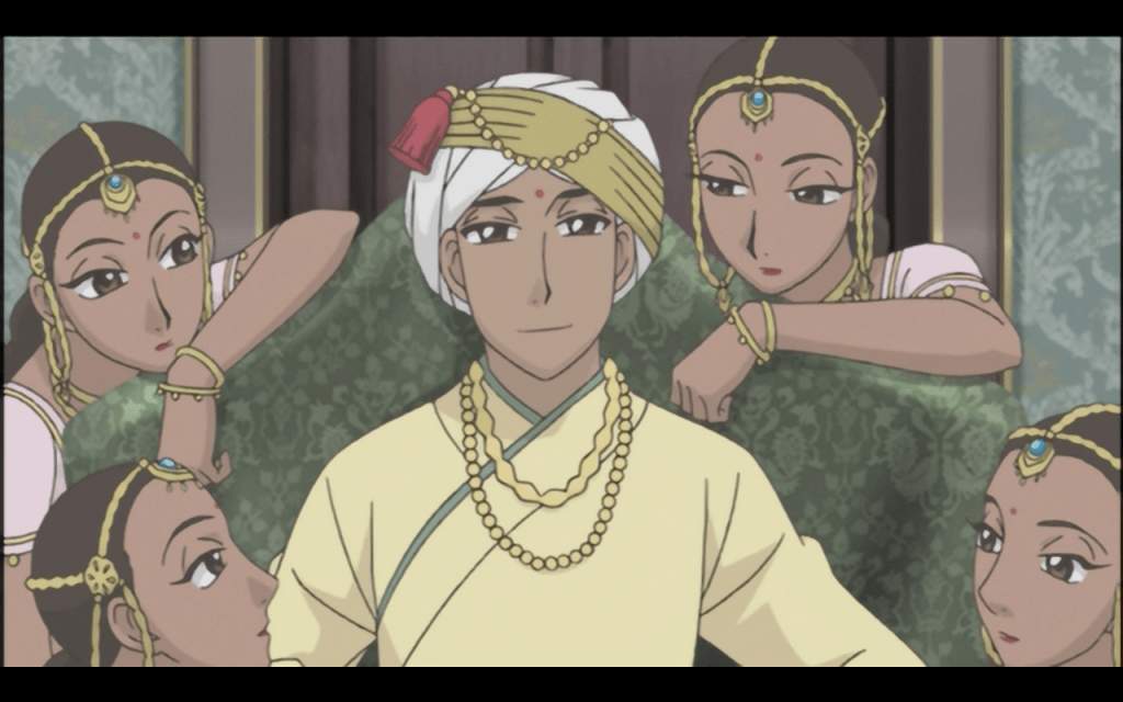 (And later, he drives an automobile—in the house. Down the hallway. With his entire harem of identical expressionless women who don’t require voice actors—because genuine harem here—draped around like so many life-sized hood ornaments. This guy…he’s problematic and he knows it. He embraces it! Seriously, Prince Hakim literally points out that he is performing an exoticized version of his own culture for the colonial masters.)