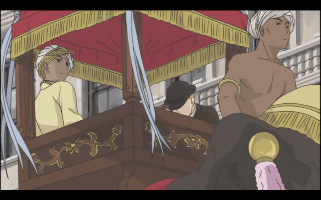 Emma is a sweet character, but rather plain as far as anime character designs go, and terribly soft-spoken and reluctant to emote. Added to this, we must wait a very long time for a bit of backstory on her. What I’m trying to say is that there really is no clear indicator—visually or in terms of characterization—as to why it is that every single male character—and I do mean every single one, even the postman!—falls in love with her at first sight. I can only presume that it is the maid outfit. Meanwhile, William is a tad shouty and equally inept when it comes to conversation and expressing himself, which means that for a number of episodes we just watch the two of them react to their more active foils, the teasing Mrs. Stowna for Emma, and the provocative Prince Hakim for William.