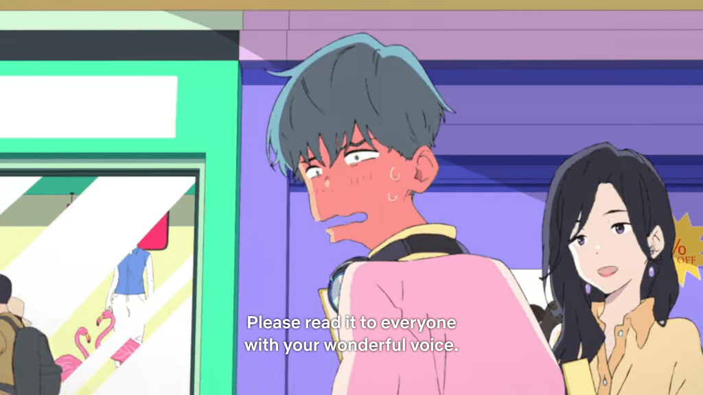 Only, that’s not what happens. Instead, their insecurities are what makes them approachable to one another—two teens who otherwise exist in such different worlds—Smile as a social media star, and Cherry as the quiet boy-poet who carries around a paper copy (!!) of a dictionary specifically for composing haiku. Popular girl and nerd boy. But they discover during their first conversation that each has their own insecurity, which they realize they are able to relate to, though not in so many words. Smile’s mask even serves to tone down her exuberance, which might otherwise have been intimidating for the quiet Cherry. From the beginning, then, their vulnerabilities draw them together, giving them grace for one another.