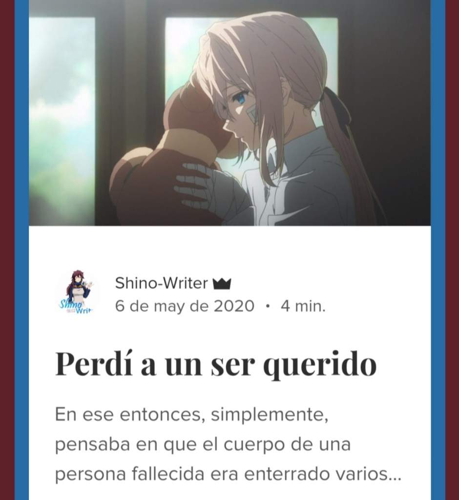 Luego, buscando inspiración, conocí a una chica que evangelizaba con videojuegos en Francia, y al comentarle lo que pasaba por mi mente al ver anime, me dijo que le escribiera algo, (escribí sobre Full Metal Alchemist). Cuando leyó mis palabras dijo que le gustaba y que yo debía compartirlo con otros. Entonces creé Shino-Writer (Traducido: Escritora de Fe) en Facebook para publicar mis primeros artículos.