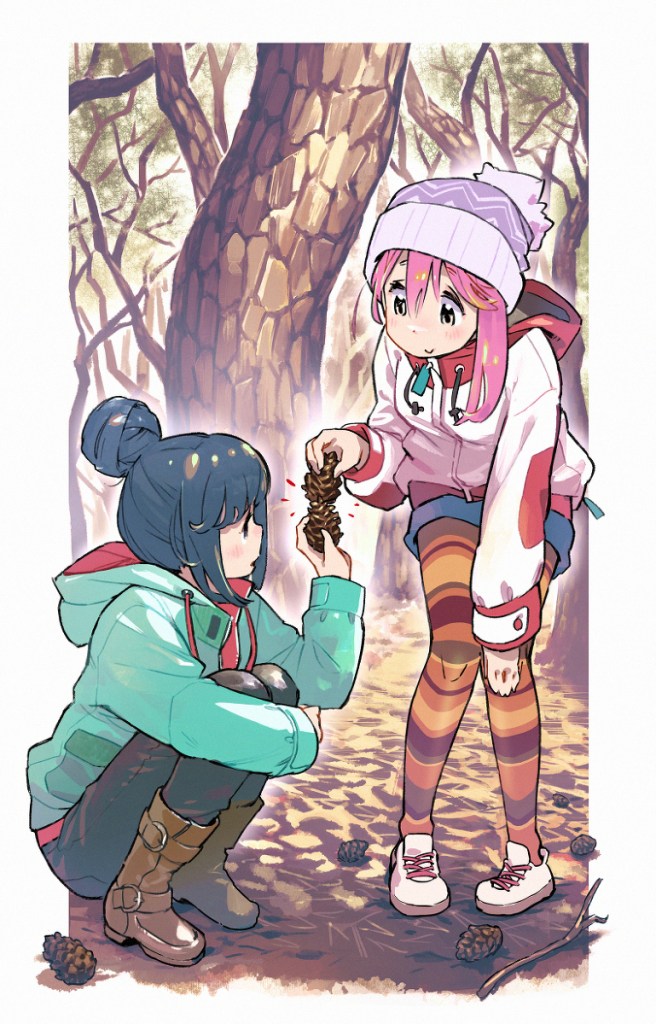 Is it starting to feel a bit like autumn out there? I hope the weather is cooling a bit and the colors are starting to change, too. And we’ll do our part to make you feel a bit more like its the fall season with this lovely illustration of Nadeshiko and Rin (Laid-back Camp), along with those loud acorns, during an autumn camping excursion!