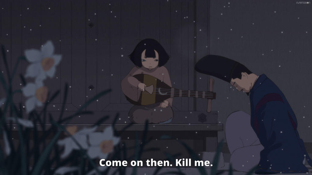 The setting is medieval Japan in an era where a loose word against the local lord can cost you your life—or that of your family member, as young Biwa learns tragically in the opening moments of this episode. The child has heterochromia, a fairly common visual trope in anime, but this particular case of the condition of mismatched eye colors is not purely aesthetic, and Biwa’s struggles with her eye are far more deadly than the anxiety that Ai suffered in Wonder Egg Priority. No, when Biwa covers her naturally-colored brown eye, her pale blue right eye is filled with visions of the future, and it seems that all she ever sees is death. After wandering for an undisclosed amount of time disguised as a boy minstrel, the self-named Biwa (a name chosen after the instrument she plays) encounters a lord, Shigemori, who also possesses a special eye, though his powers of sight are weaker than hers and his eye coloring less pronounced. He is determined to win Biwa’s trust because she has seen the destruction of his clan, the Heike, and he is hoping to persuade her to help him avert their disastrous future which, although he has not seen with his own sight, he has been able to anticipate according to the unavoidable fact that all tyrants fall and his clan are becoming tyrannical. They were responsible, after all, for killing Biwa’s father. And so begins a tale of found family and family feud; of politicking and intrigue, poetry and coming of age; of special abilities and the limits of power; and potentially of the healing of one little girl’s heart.