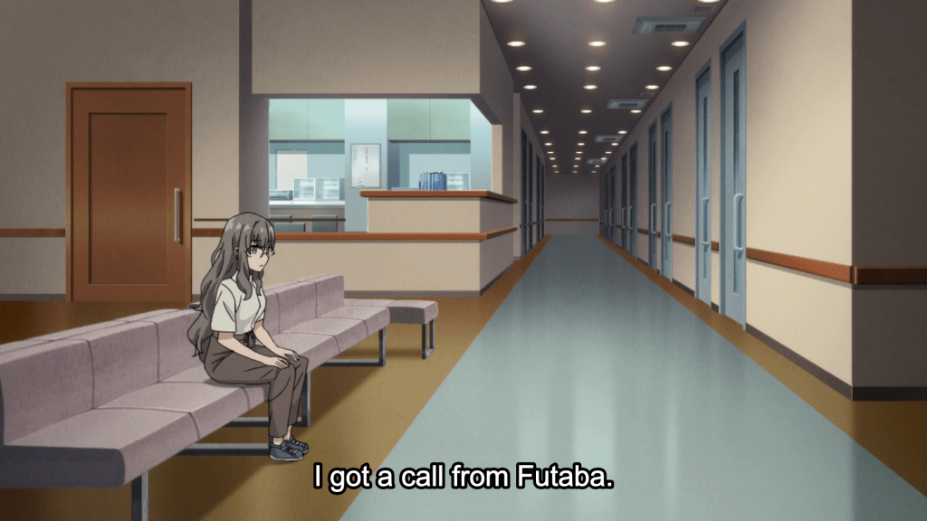 After checking in with Mai, Sakuta finds Rio alone in the waiting room and sits beside her. He apologizes for the inconvenience, and they share some light-hearted banter before the conversation dies out. In the silence of the quiescent hospital ward, Futaba begins to voice an apology of her own. But Sakuta abruptly cuts her off. He’s close enough to Rio to know what she’s going to say: that she’s past the point of coming to terms with herself, even though she’s terrified of being left alone. No more tedious explanations—no more fighting the air—no more wrestling with the world.