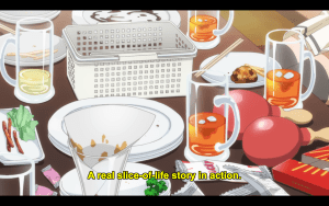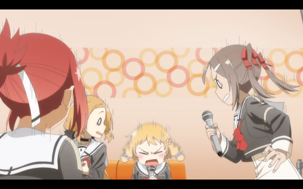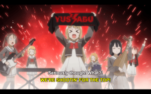 Fuu on drums, Itsuki on keys, Karin “Nibosshi” on bass, Togo “Wasshi” on…biwa? And Sonoko thrashing on a Les Paul, roaring out “Udon! Udon! Udon! Udon! Rawwwwrrrr! Tasty!” With Yuuna as awkward background performer. The Hero Club Rock Band Yuyuyu is born! (Think K-On meets Aggretsuko.) But wait, after some karaoke and a feast, we cut to a new scene and a new theme: the middle-school girls are now strategizing Itsuki’s rescue in an airsoft match (that Wasshi takes way too seriously of course), à la Gun Gale Online. And after that, they channel Yuru Camp and embark on a relaxing wilderness holiday, where Itsuki proves to have all the enthusiasm and none of the skill of Nadeshiko when it comes to cooking their supper (although the girls declare her glowing purple curry to be delicious).