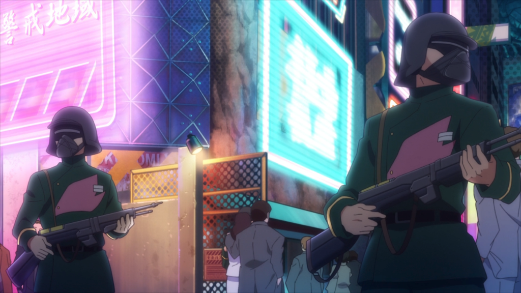 Akihabara is in flames as giant police dog mechas bear down on panicking people. Suddenly, a metal fist pummels a mecha dog just as it’s about to crush a man, and the narrator kicks in. Flash back to a few hours earlier, as Hosomichi is heading to work around the time most citizens are being forced home by the curfew. What is his job? Hosomichi is a host in the last remaining Host Club in the so-called pleasure district, where people deal in otome and eroge games down shady back alleys. It’s the only remaining place in the world where one can be an otaku, but even then, one must constantly dodge the police and scathing looks of passersby. This is Fantasy Country Japan, and it’s under occupation by True Country Japan, a military dictatorship intent, it seems, on purging all forms of entertainment from the face of the earth.