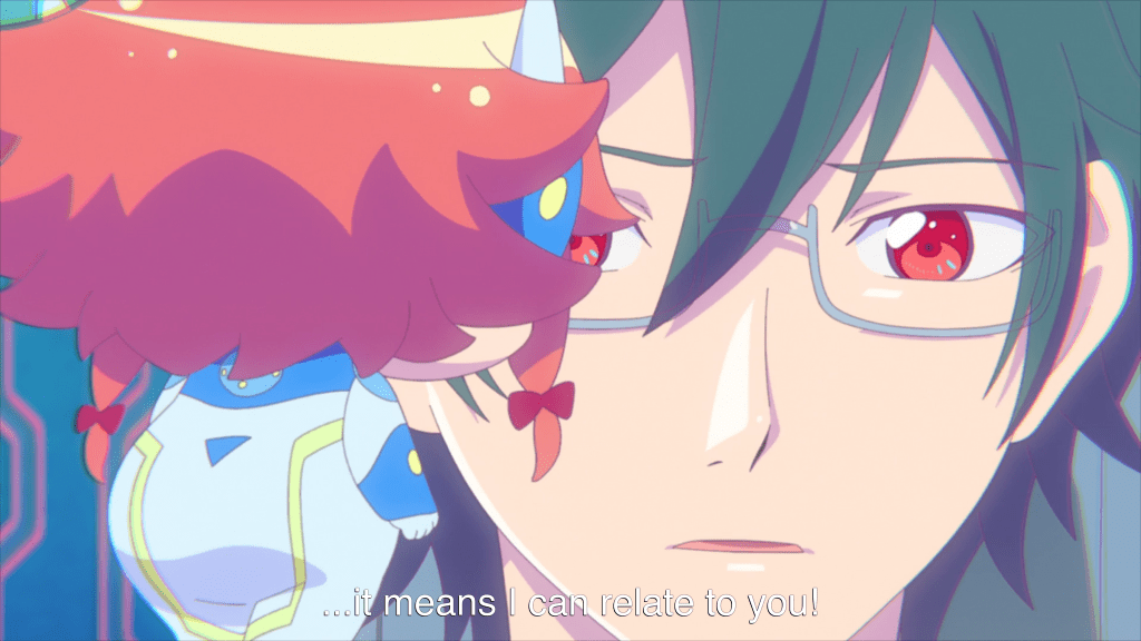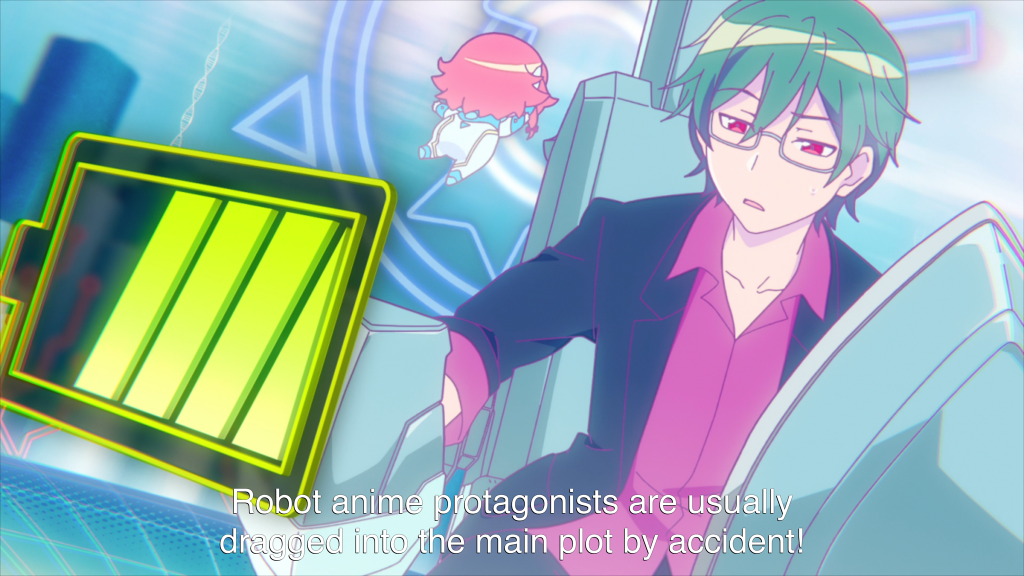 This series is going to be infinitely screencapable! So many otaku in-jokes and fourth wall-busting. (For example, Hosomichi points out the illogical nature of Battery Girl’s catchphrase. Finally!) The world-building is pretty fun, and the combination of a melodramatically serious military dictatorship and the criminalization of otakudom alongside an mc who is reluctant to admit he likes anime is sure to keep the humor flowing. Don’t get me wrong—the hilarity isn’t on the level of, say, Wasteful Days of High School Girl, which also has fun with otaku culture, but it’s still pretty decent. Plus, Battery Girl is the least annoying mecha avatar I’ve yet encountered, and is also probably the most relatable character in the show so far. The twist at the end will have me tuning in for another week at least to see if this series can continue to bring the laughs and whether shared passion for anime can save the world…