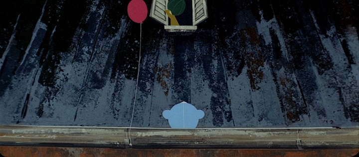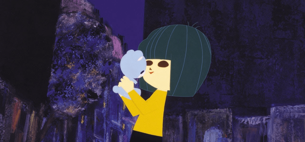 I concur. Released four years before Huston’s film, this short experimental film by Tezuka feels like a 36-minute-long cousin to Fantasia or Silly Symphonies. It brims with creativity and new techniques, with life and nostalgia. It makes a point of cleverly doing a lot with very little, reusing choreography and shots, and limiting movements while filling them with deep, simple beauty. The music and images push each other forward in this depiction of a typical street in a typical neighborhood, where a girl tries to regain her teddy bear after it falls out of the window and gets stuck on the roof.