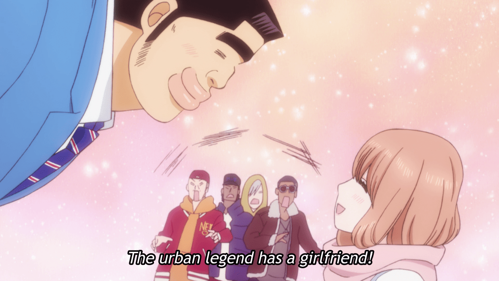 The episode kicks off with a bunch of rough looking hoodlums walking down the sidewalk, acting like they’re the baddest guys around much to the fear of those around them. Of course, this gets their jollies off, and the conversation starts up about this mysterious huge guy who beat up a cop, and is strong and big like a bear. Of course, the leader thinks this is just a myth…until said hulking beast appears from behind, scaring the crap out of them. And what’s stranger…he has a girlfriend! Of course, this is our big loveable lug Takeo meeting up with his adorable girlfriend Rinko. Roll opening credits!