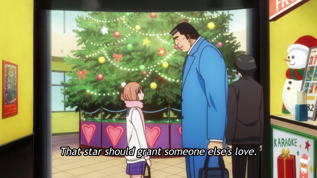 Later on, Takeo and Rinko meet up to make the reservations at a local karaoke bar for the party. While finishing up the arrangements, Takeo notices the large Christmas tree in the middle of the plaza. The cashier says that if someone climbs up the tree, plucks a particular star off the top, and asks someone out, they’ll say yes. Of course, due to the tree’s height and frigid temps, it is pretty hard to do. When the cashier states that Takeo could probably do it, Takeo declines. saying that he doesn’t need it. Bless his heart. On the way home, Takeo spills the beans that Kurihara wants to confess to Nanako at the party. Of course, Rinko is right on board with this and suggests that the two of them give the potential lovebirds plenty of time to be alone.