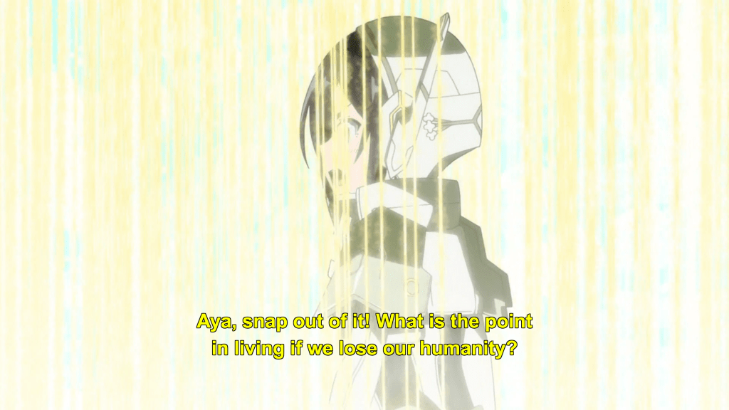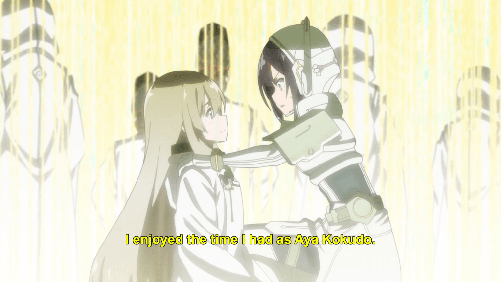 Like Yuna, Aya is committed to this sacrifice. Like Yuna, she tells no one what is being required of her. And like Yuna, she walks toward her fate with a gentle smile on her face, reconciled to her pending non-existence and already dissociating from the person known as Kokudo Aya. She will play her part to save humanity.