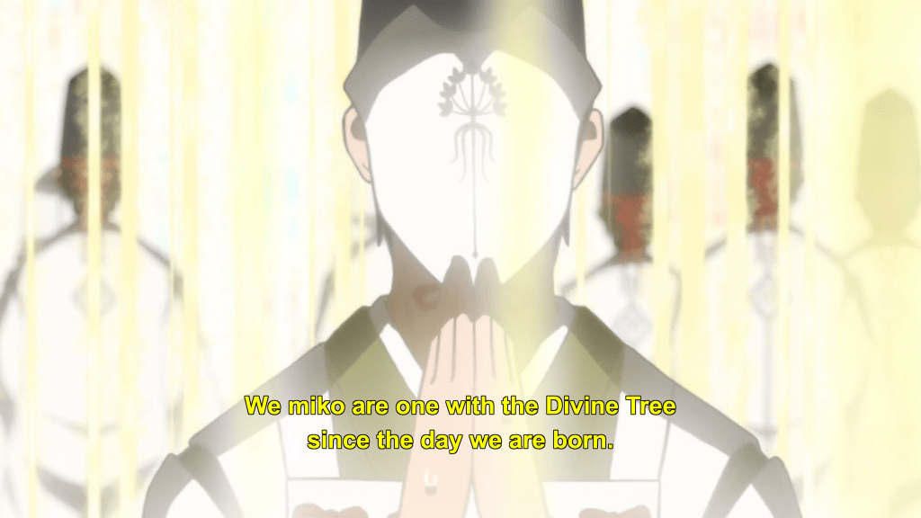 At first, she simply tries harder to keep everyone safe. But on the day of the Shinkon wedding, Yuna is not the only human sacrifice lined up by the Taisha. So too is Mebuki’s dearest friend, the miko or priestess Kokudo Aya, who must lead a contingent of adult priests in transcendent prayer to power humanity’s greatest weapon, a giant tower cannon, and buy time for the ceremony. In other words, she needs to pray to the point of surrendering her selfhood, allowing her body to disintegrate into dust.