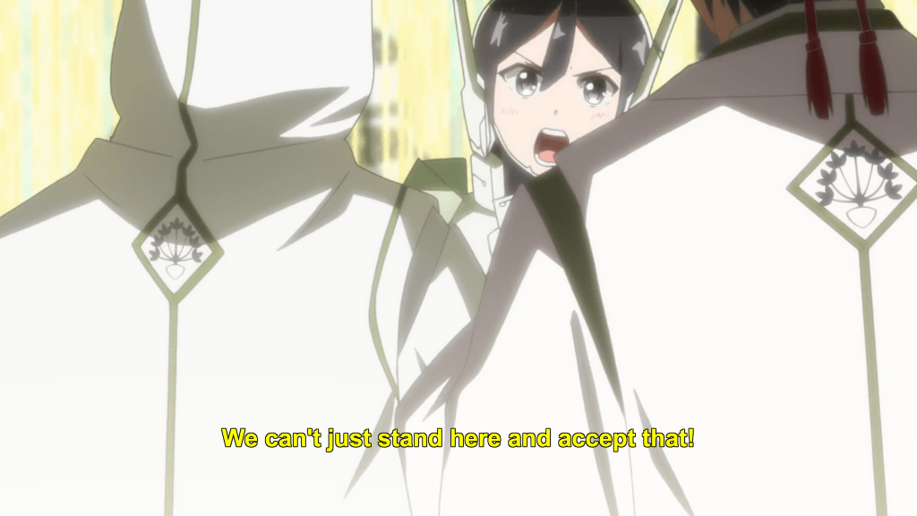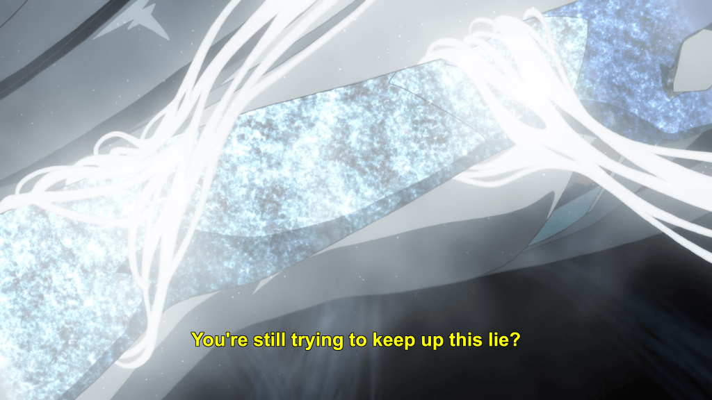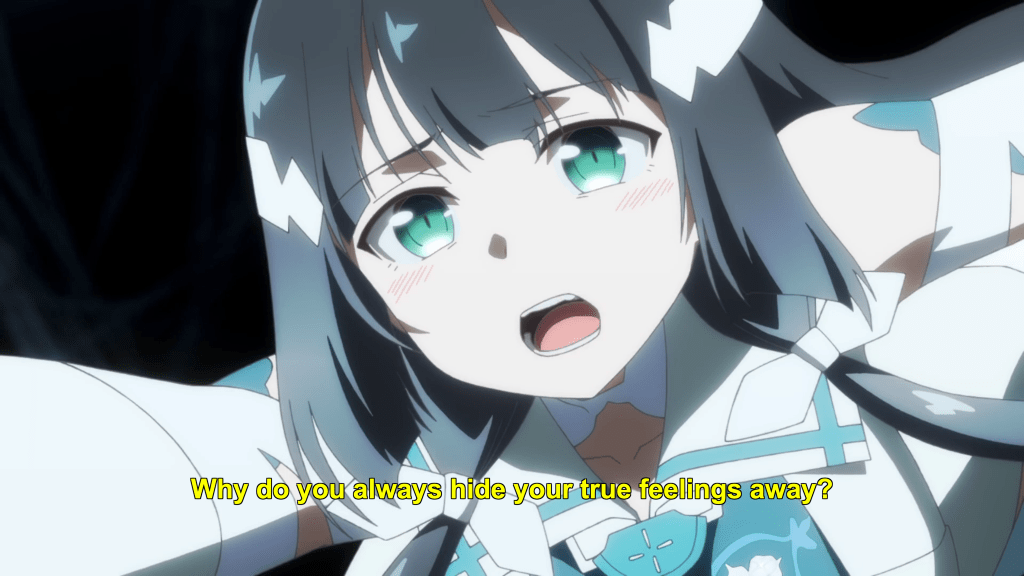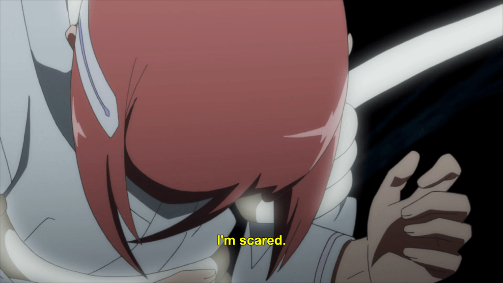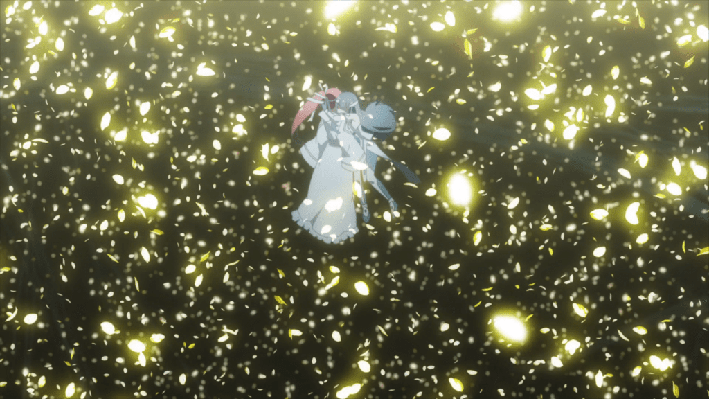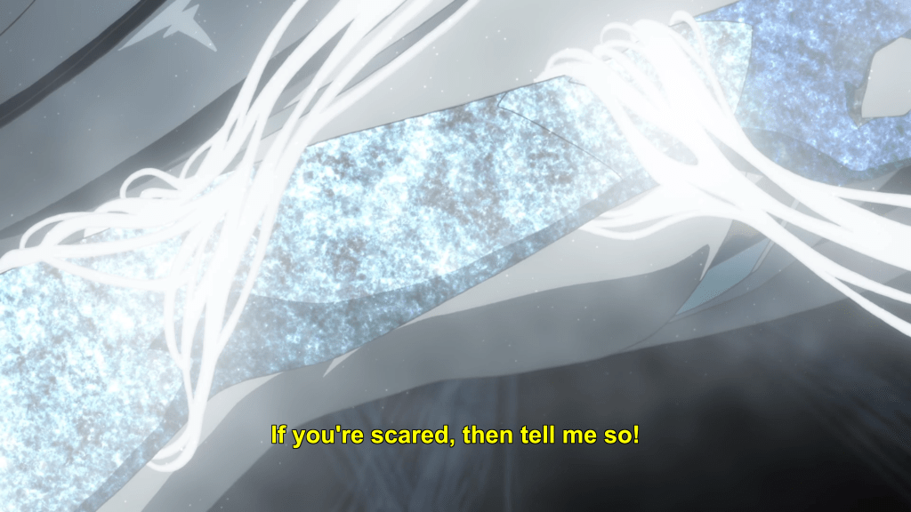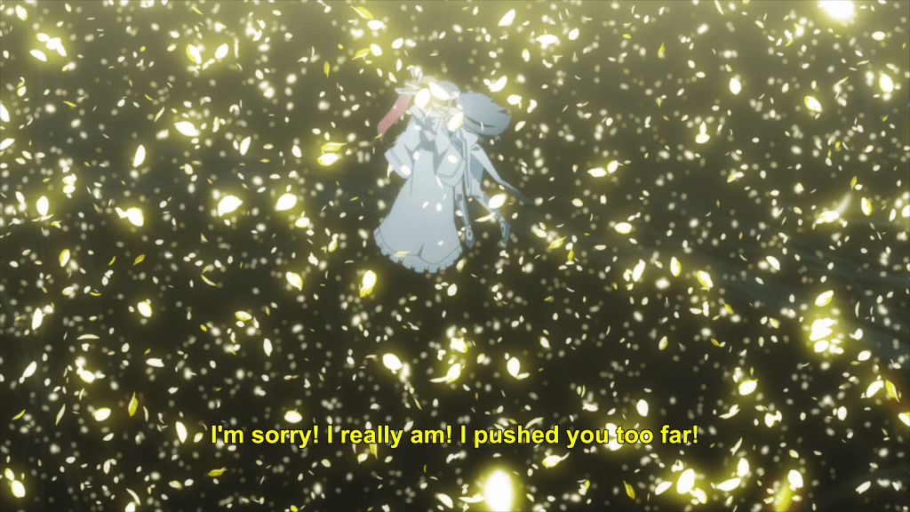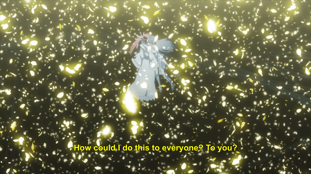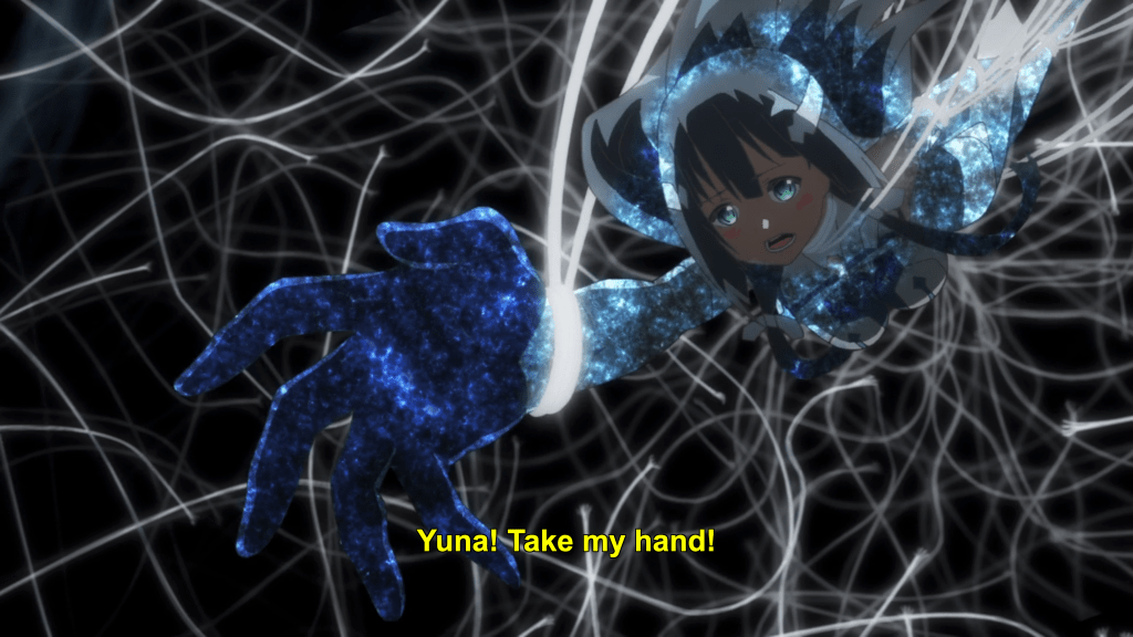 This same sequence of events plays out with Yuna as well. In episode 11, the efforts of the Hero Club to rescue Yuna from her Madoka-like self-sacrifice finally see fulfillment as Togo makes it to the unearthly realm where Yuna is laying down her humanity and dissociating into a pink spirit-like being (albeit still clothed, unlike Madoka). Like Mebuki, she demands that Yuna speak honestly and make a decision of her own volition and not according to duty or notions of saving the country. It’s a painful exchange, for Yuna has secretly been isolated and alone, alienated in herself from her friends for far longer than was Aya, caught up in her perceptions of her duty to brave it all alone. Eventually she too confesses that she wants to live and not die; that she wants to retain her humanity and not transcend—all the truths that Homura tries to wring from Madoka in Rebellion.