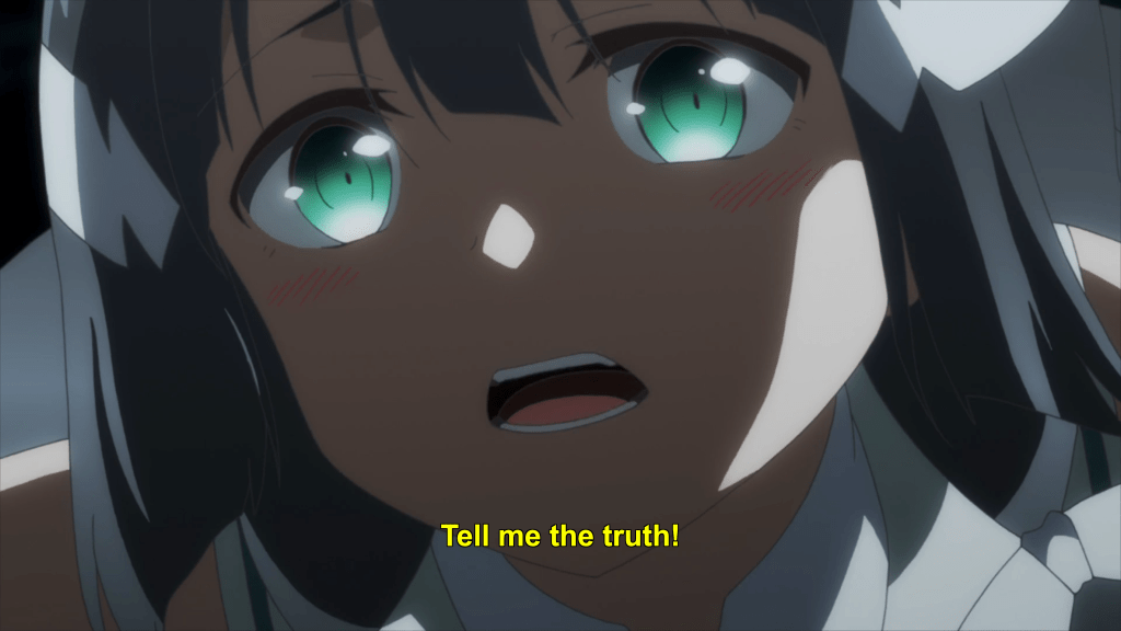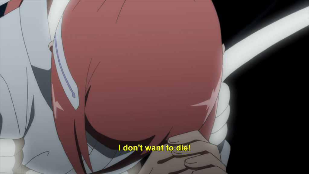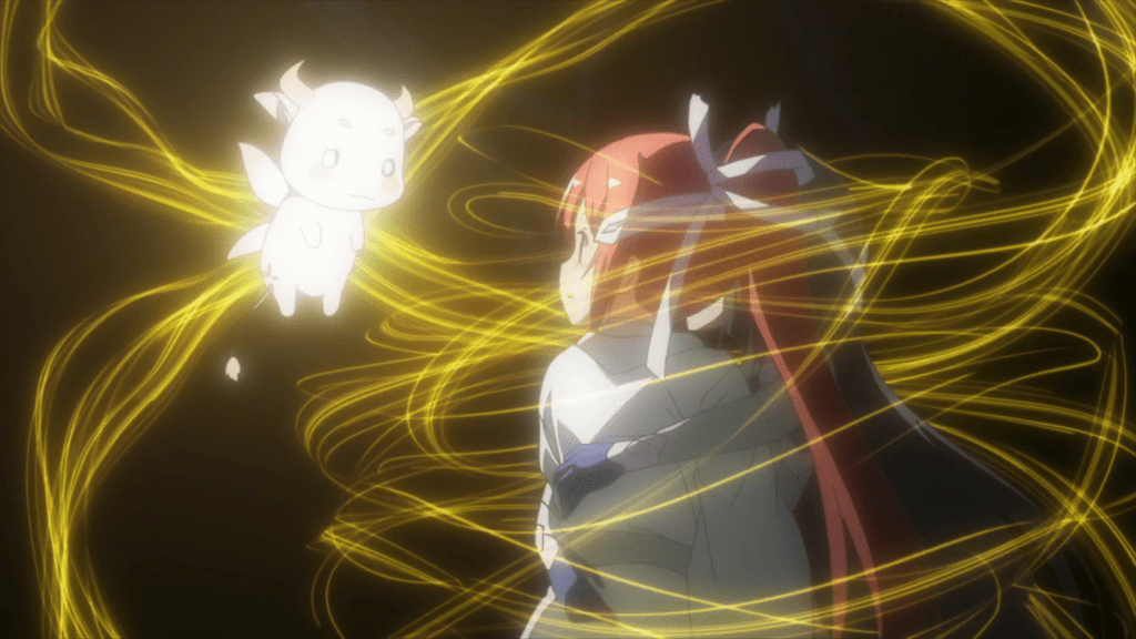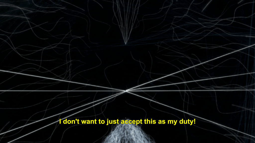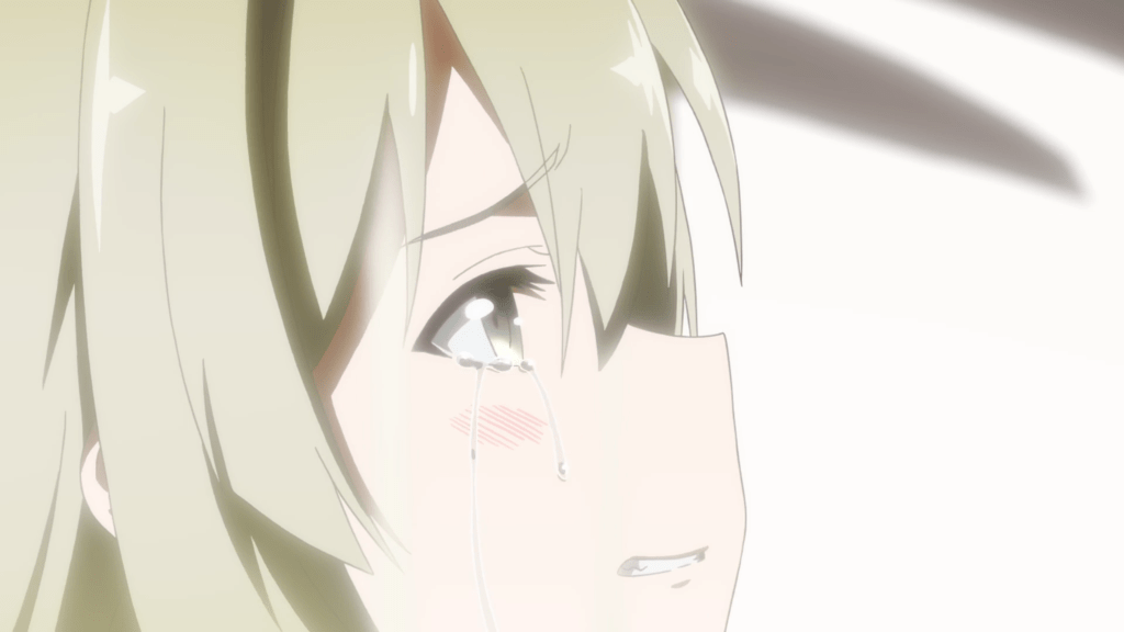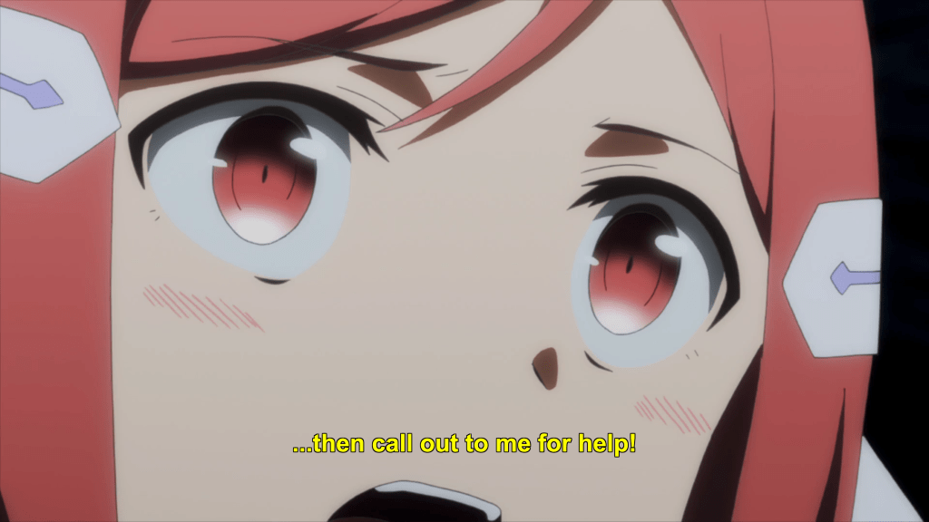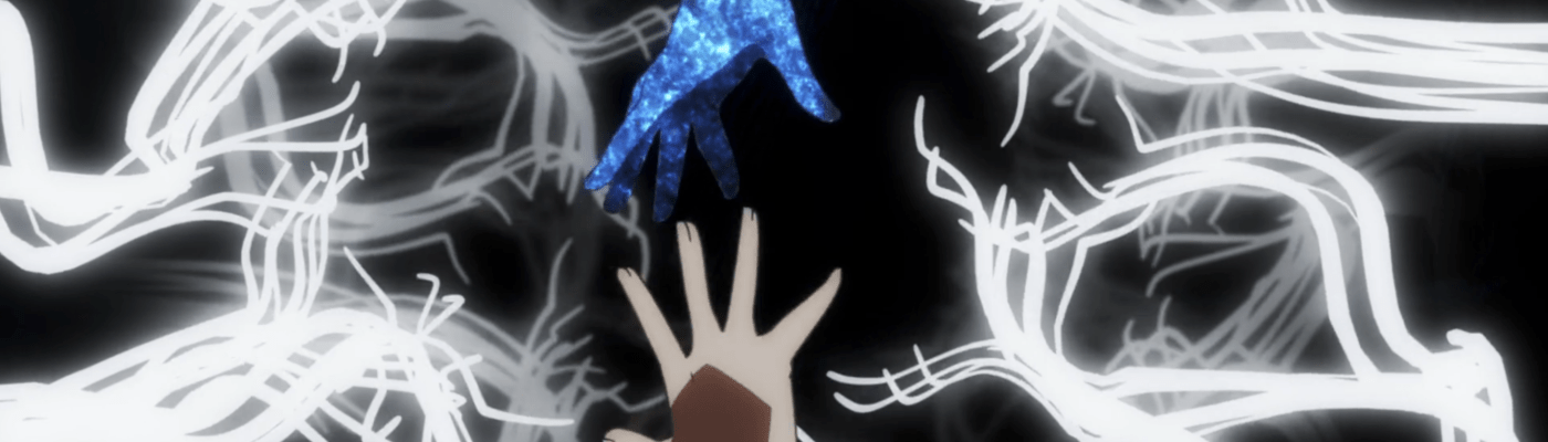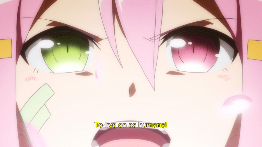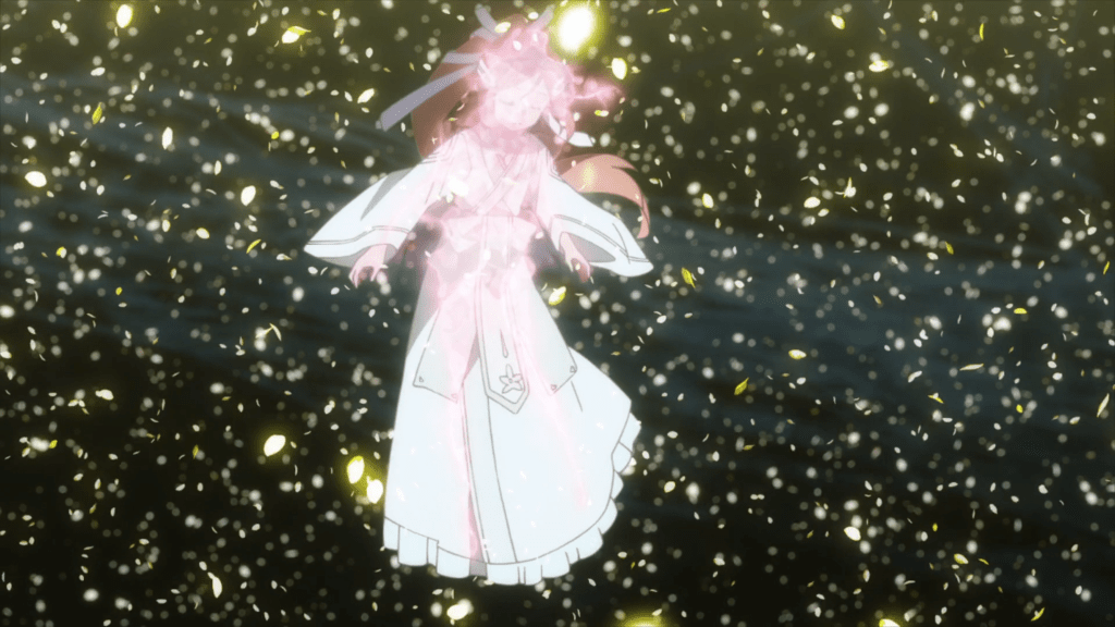 This same sequence of events plays out with Yuna as well. In episode 11, the efforts of the Hero Club to rescue Yuna from her Madoka-like self-sacrifice finally see fulfillment as Togo makes it to the unearthly realm where Yuna is laying down her humanity and dissociating into a pink spirit-like being (albeit still clothed, unlike Madoka). Like Mebuki, she demands that Yuna speak honestly and make a decision of her own volition and not according to duty or notions of saving the country. It’s a painful exchange, for Yuna has secretly been isolated and alone, alienated in herself from her friends for far longer than was Aya, caught up in her perceptions of her duty to brave it all alone. Eventually she too confesses that she wants to live and not die; that she wants to retain her humanity and not transcend—all the truths that Homura tries to wring from Madoka in Rebellion.