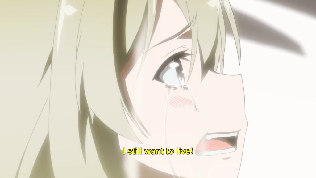 When Mebuki realizes what is happening (prompted by the fact that the sacrificial prayer is not actually working), she bursts in on the ceremony and demands that Aya choose for herself what she wants to do, giving her permission not to do and say what is required of her by the religious institution and her years of training as a miko. After a dramatic pause, Aya’s mask of selfless serenity finally cracks in the face of her friend’s tears and anger on her behalf, and she cries out that she wants to survive.