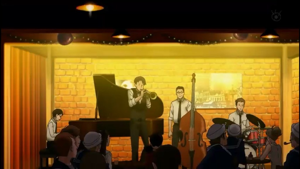 This actually happens during our Christmas episode. Sentaro, the guy of the “swing”, has been grumpy and distracted, and Nishimi has been trying to make him respond with his music. It starts to work. And then, a drunkard makes a racist comment, and the young musician finally loses his temper. He almost starts a fight. When Junichi, the man he respects and loves as a brother, stops him, he just walks away in disgust.