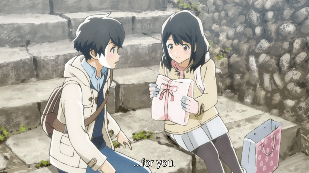 With regards to Christmas…It was mentioned. Yup. That’s about it. Christmas was mentioned and our two lovebirds went out a Christmas date. I don’t recall seeing a single solitary Christmas tree, nor a single chorus of “Jingle Bells” or “Santa Claus Wants Some Lovin’”, nothing. This could’ve taken place at any time during the year, and it would’ve played out exactly the same way. In fact, a lot of the montage that takes place during their little date looks more like a New Years Day shrine visit instead of a Christmas Date! Heck, at least the Christmas episode of Space Brothers I reviewed last year managed to incorporate Christmas into the narrative somewhat, using the Christmas lights to (or lack thereof) to show how our rookie astronaut Kenji felt about his duties as a father. Shoot, the Christmas episode of Ore Monogatari I did earlier did a better job than this episode of using the holiday somewhat effectively. This one only used Christmas as an excuse for our young lovebirds to exchange gifts. I’m gonna need you to do better, Japan.