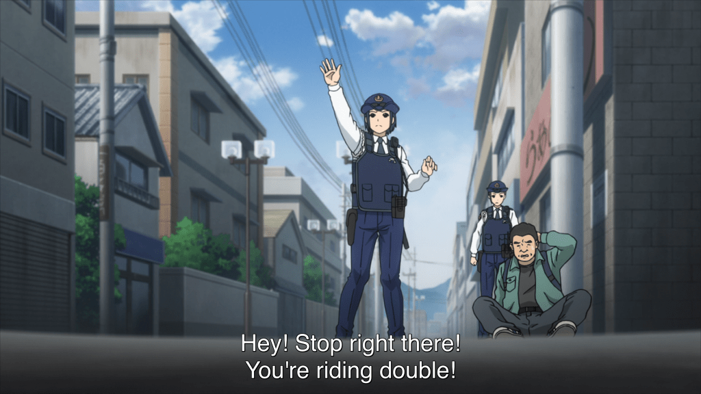 I’m not really sure what to make of this one! Some of the jokes were fantastic, and the female buddy cop dynamic has potential, given Fuji’s contrary personality and Mai’s tendency to overshare, turning every simple question into a set-up for an emotional childhood flashback scene—like, every time. Which is funny; and a little annoying. She definitely cannot read the room. But the humor is also at times what my Gramma would have called “near the knuckle”, which the dictionary defines as “verging on the indecent or offensive”. This is especially true of Mai’s father, who likens Fuji to a porn star. So be warned. Like any self-respecting slice-of-life series though, Police in a Pod also has a more serious side, and doesn’t pull any punches when it comes to depicting the kind of abuse that traffic cops come under. This is something that discourages Mai greatly, and seeing Fuji handle it with such an assertive, devil-may-care attitude is exhilarating to the timid Mai. The scene at the primary school is gold, as Mai is forced to convince an assembly full of children that following rules is important, when she herself feels a little ambiguous at times about enforcing them. The art is clean, in the usual Madhouse way, with sparkly Chihayafuru/My Love Story eyes and decently dynamic action shots that keep the episode ticking along nicely. I’m just not sure where it’s going. It doesn’t fit neatly into a particular sub-genre of comedy/slice-of-life, like “workplace comedy” or “cute girls doing cute things”, but instead seems to switch tones a few times. But that may be a deliberate part of the world-building, reinforcing the idea of the two leads’ unconventional personalities. Time will tell, I guess, and I’ll give it one more episode at least to convince me, more out of curiosity than anything.