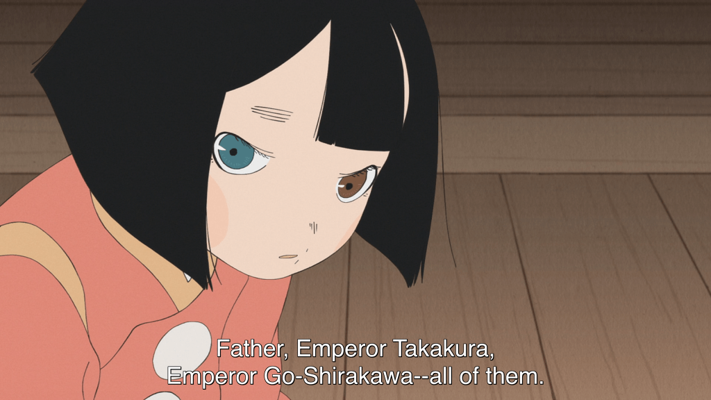 Finally, assuming that you’re reading the Royall Tyler translation (which is really, really the one you should go for if you’re reading the Heike Monogatari in English), you may be somewhat confused to find that many characters are referred to by different names—for example, Tokuko is always “Kenreimon-in.” At the request of a friend who was having trouble keeping all of the people in the adaptation straight, I wrote up a complete character guide you can find at
